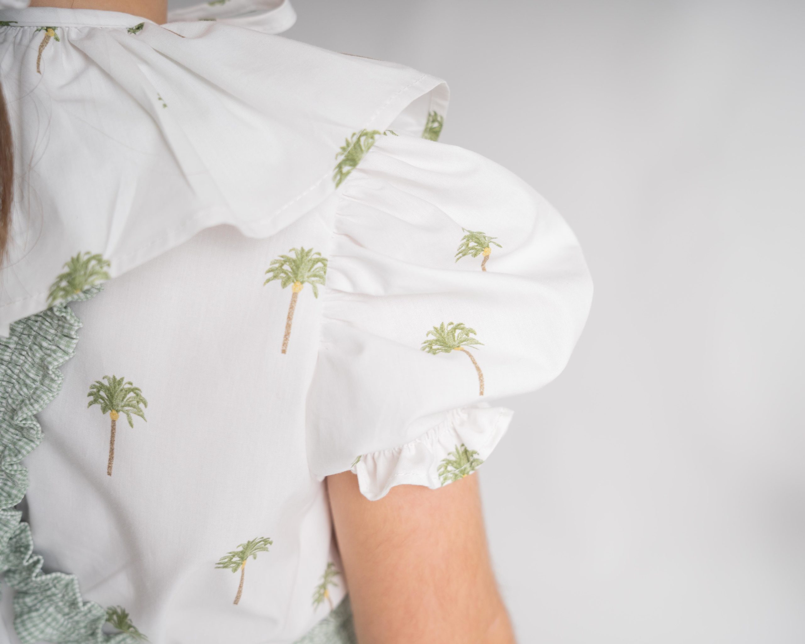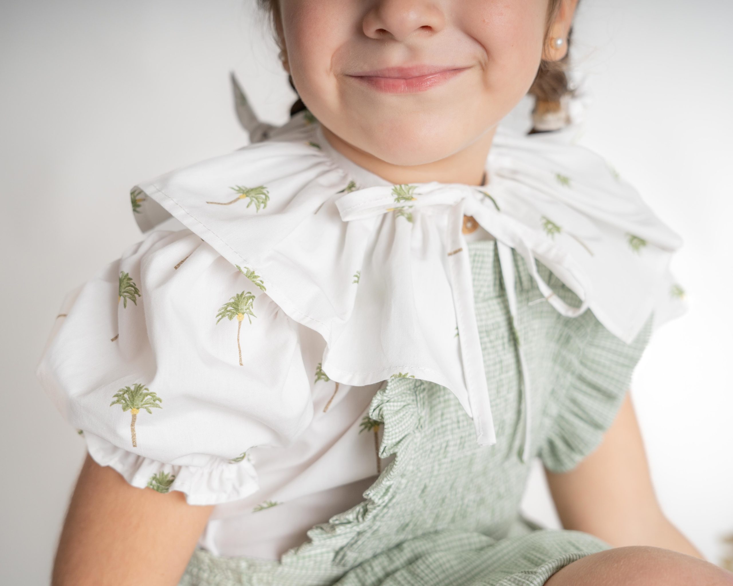 Nuestra Camisa Candela Palmeras de tejido EXCLUSIVO sienta ideal a nuestras niñas y su cuello con lacito es para morir. Combina ideal con nuestra familia Minivichy cactus.