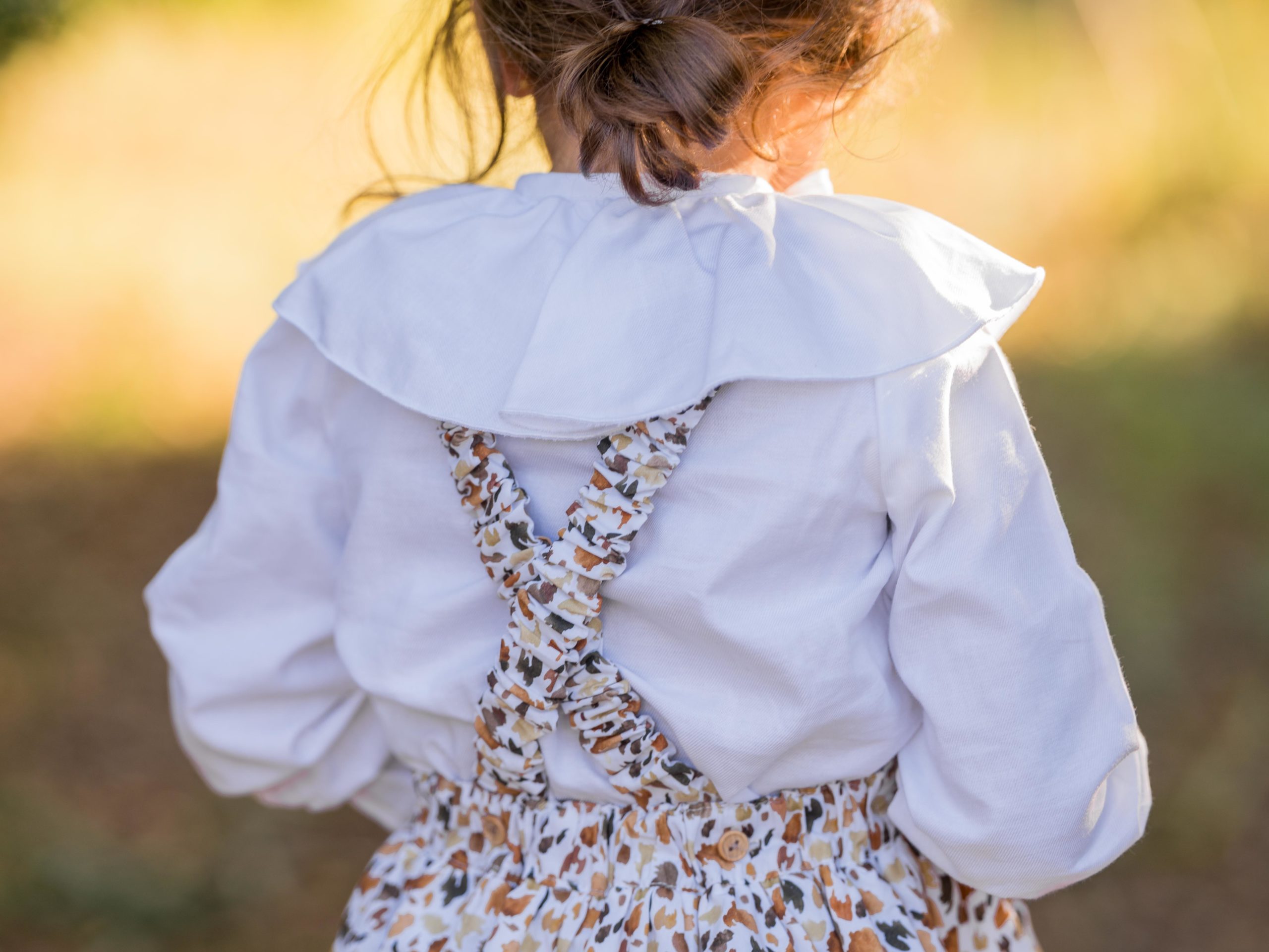 Camisa capa en tejido de viyela blanca con cuello muy especial, será la delicia del armario de tu peque ya que le dará el toque a todos los petos, faldas y demás.. con cuello capa con terminación en lazada.