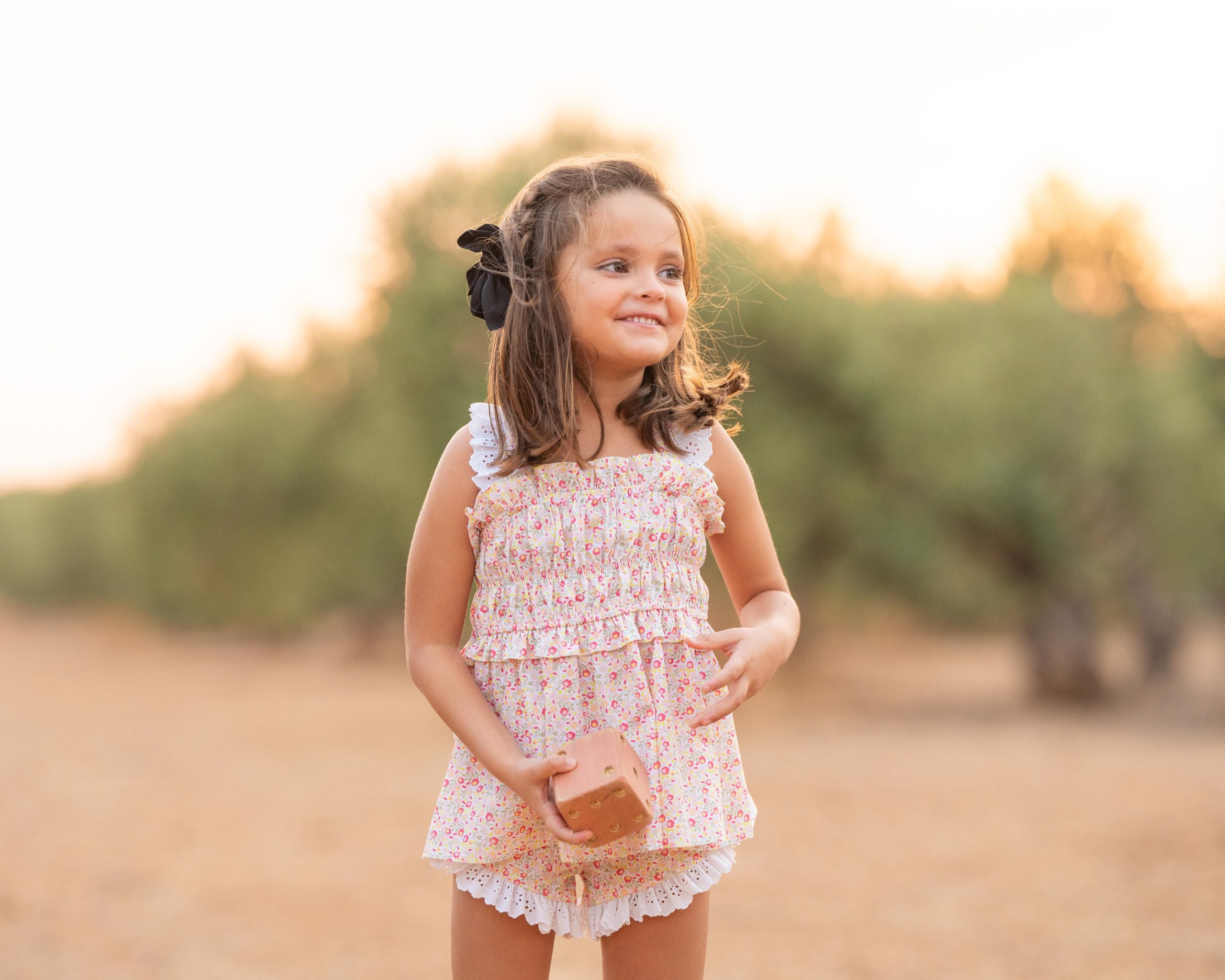 Camisa El Terril súper favorecedora y alegre, con nuestro estampado exclusivo de flores, su pecherín engomado y sus manguitas de tirantes en tira bordada la hacen única.