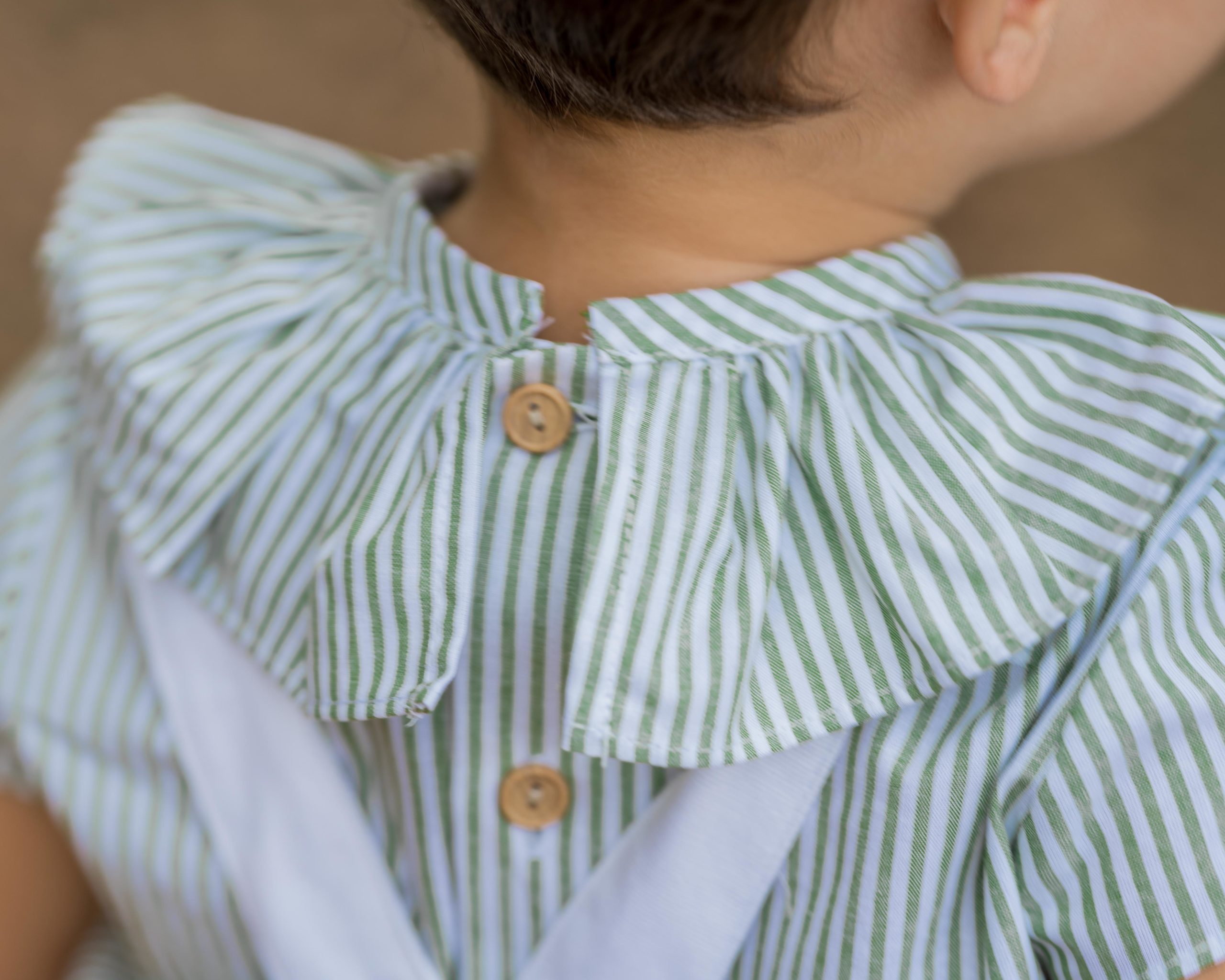 La Camisa Manuela que tienes que tener en el armario de tu peque con cuello volante y manga corta. De rayas verde lima, Ideal para combinar con nuestros culetines.
