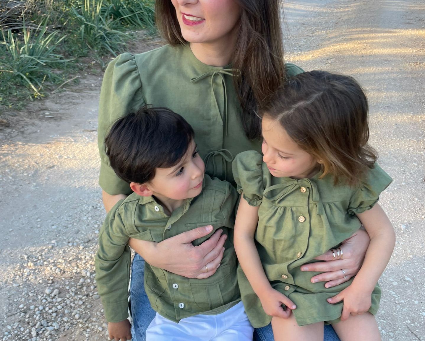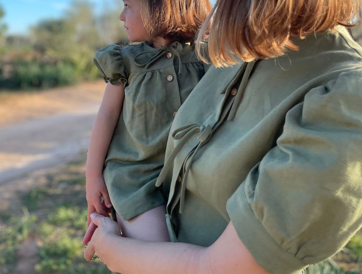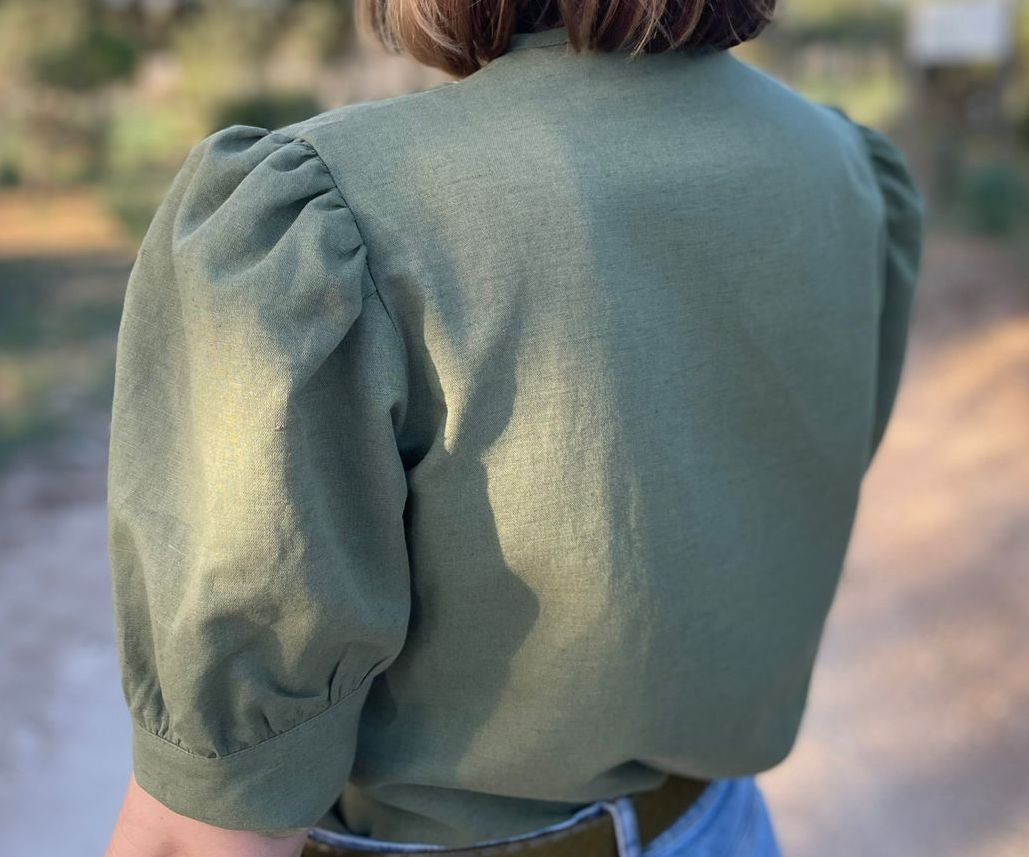 Camisa de mujer de lino verde con mangas abullonadas y lacitos, ideal para estos días de verano.