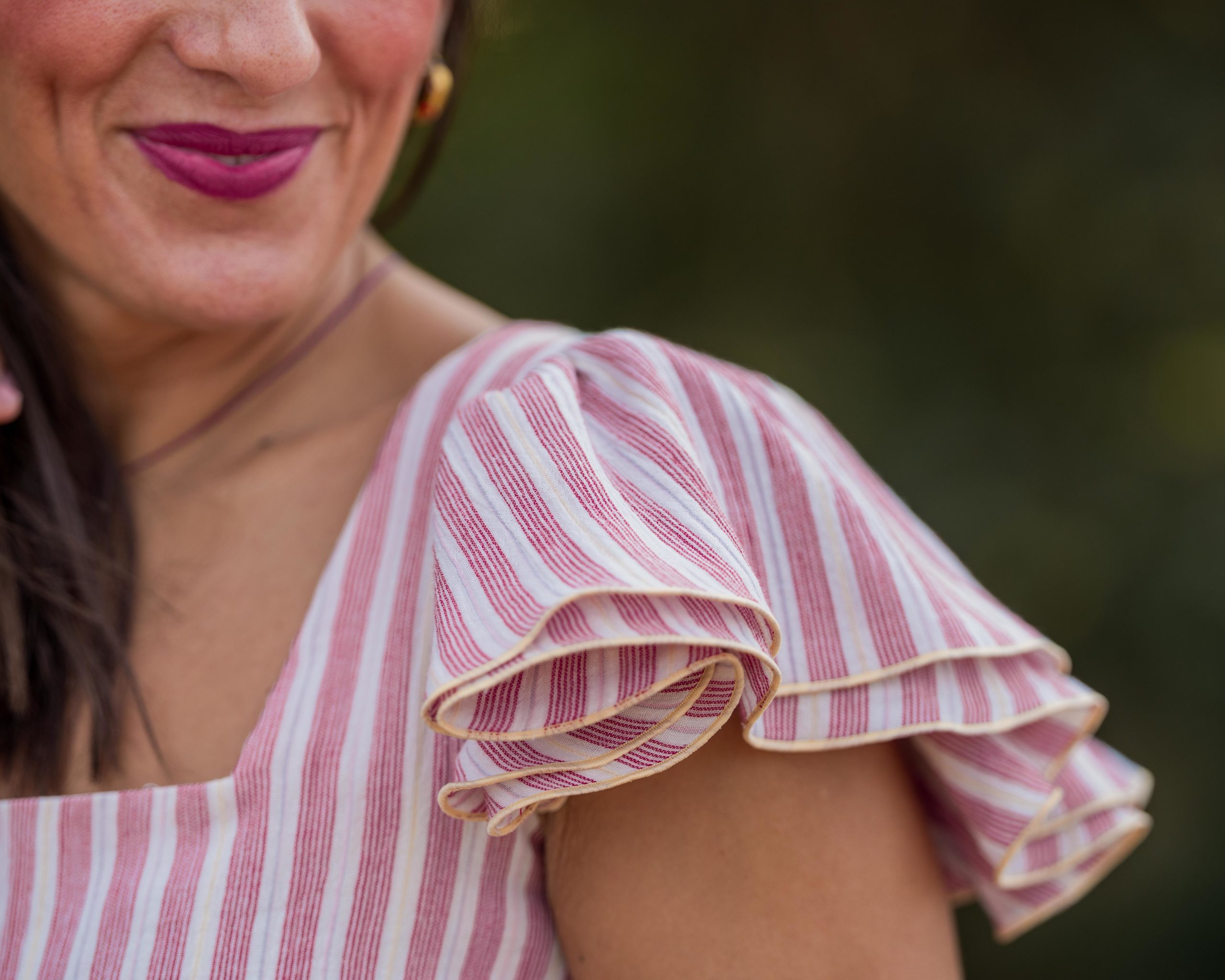 Camisa mujer de rayas rojas , azul, amarilla y rosa en tejido de doble gasa. Muy favorecedora.