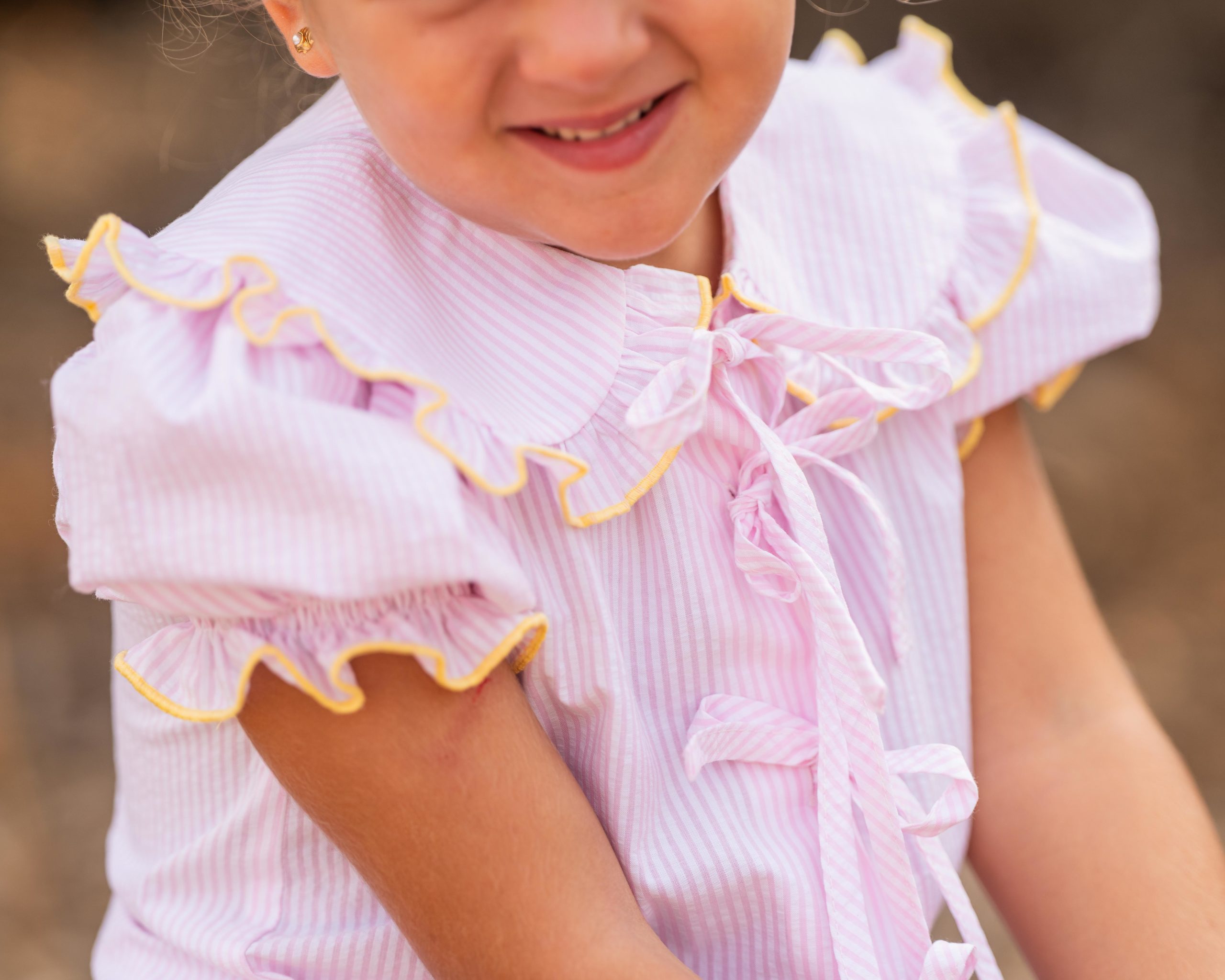 Camisa de rayas rosas con cuello bobo con volantito y repulgo en amarillo. Terminaciones en lazos que la hacen especial y única.