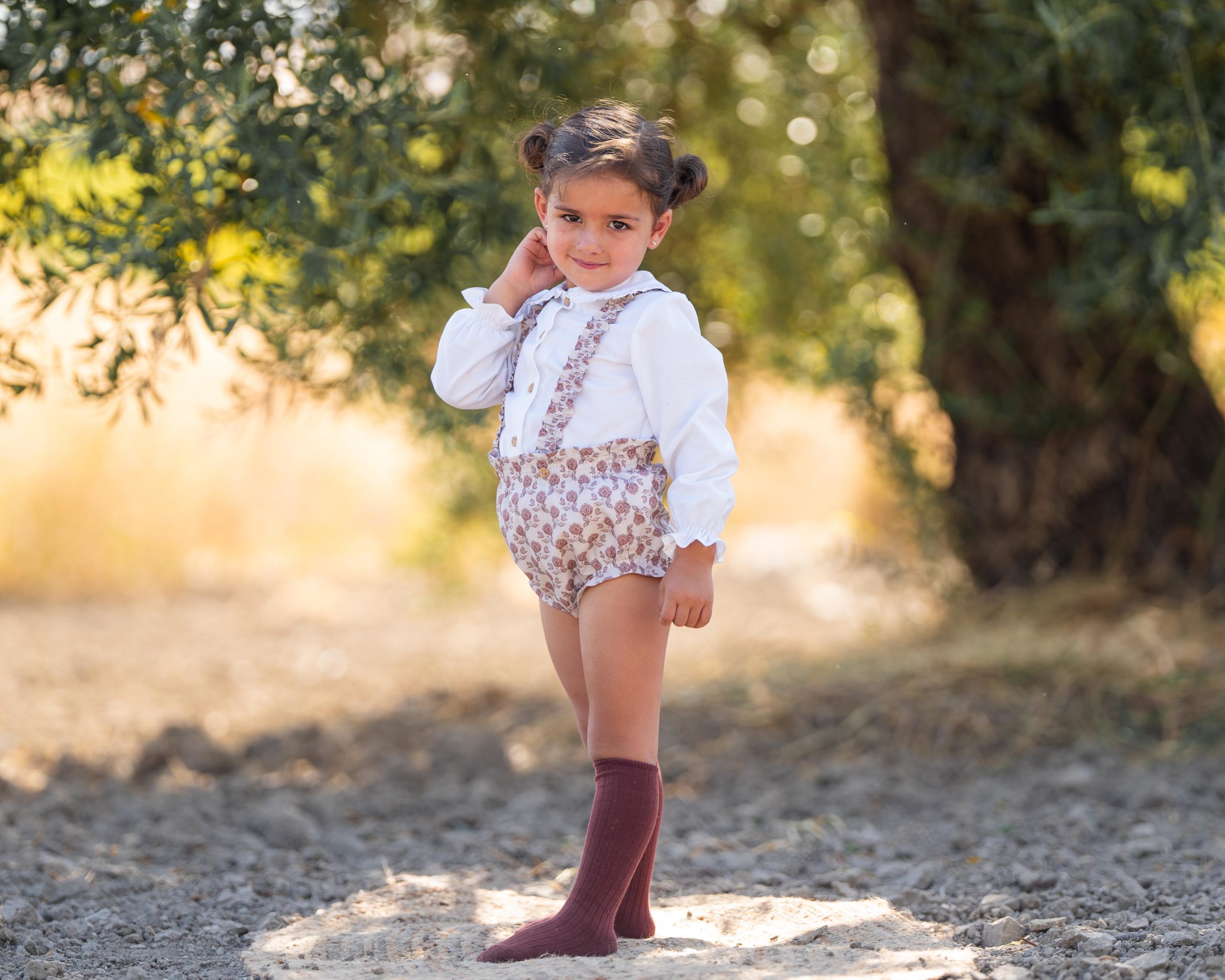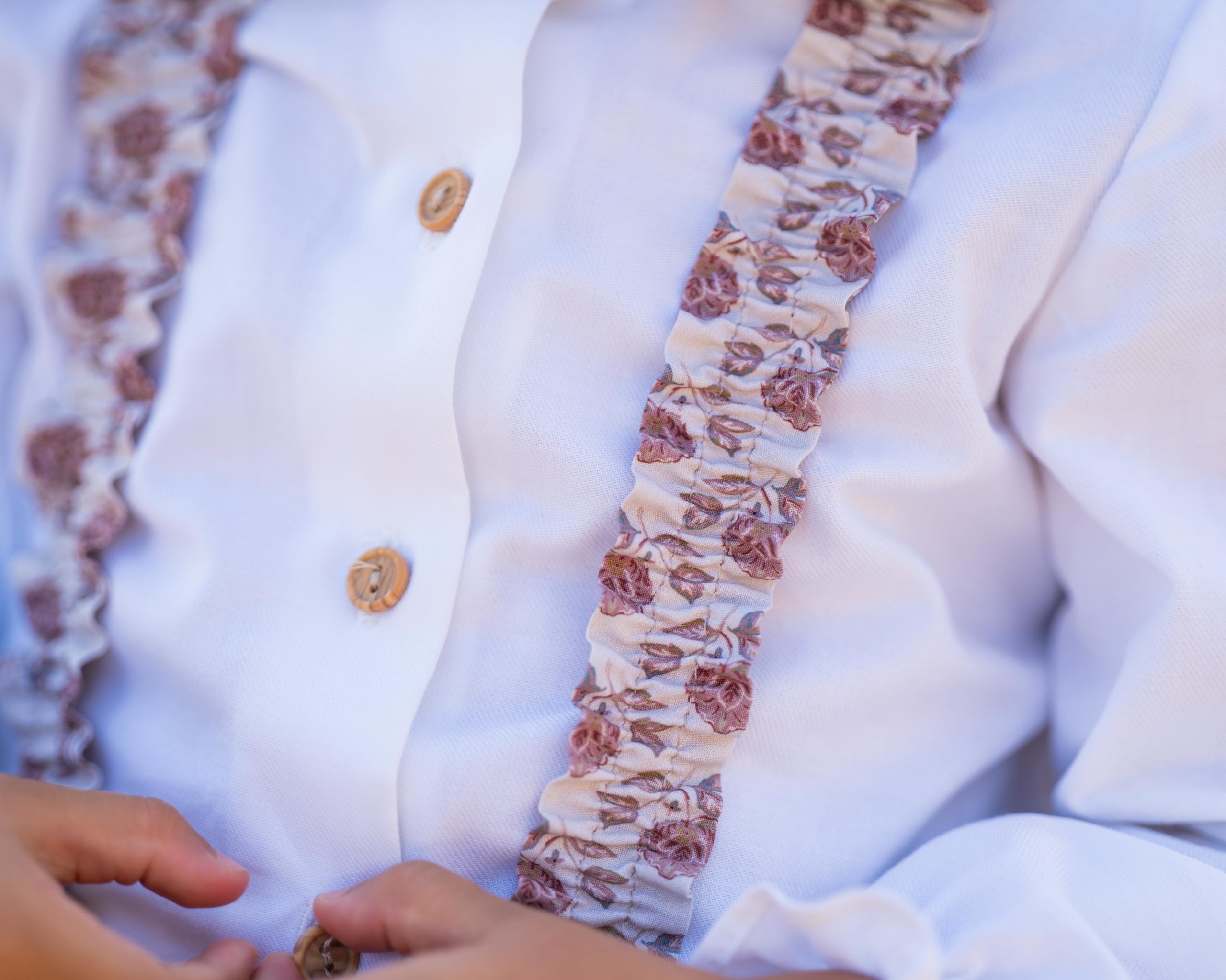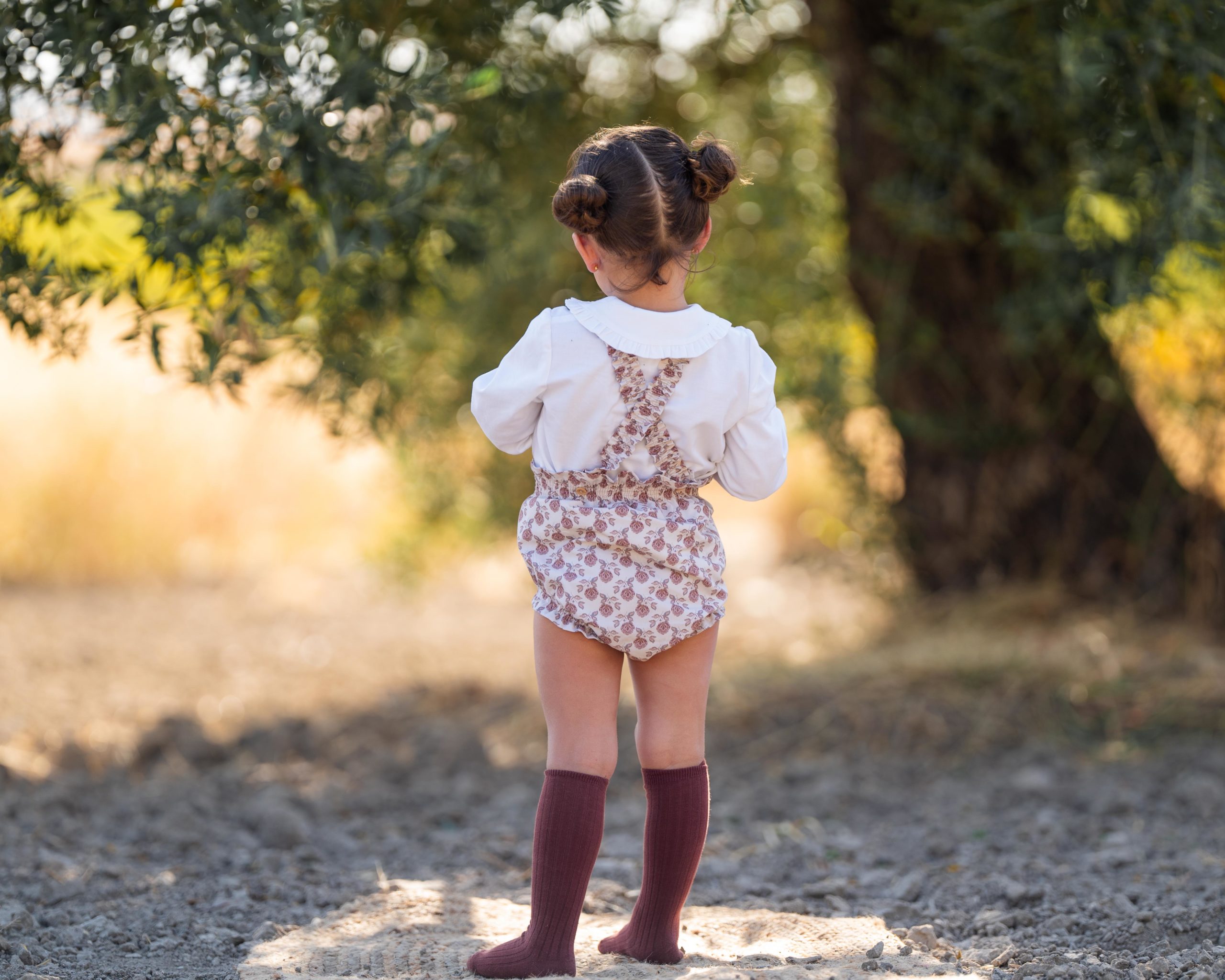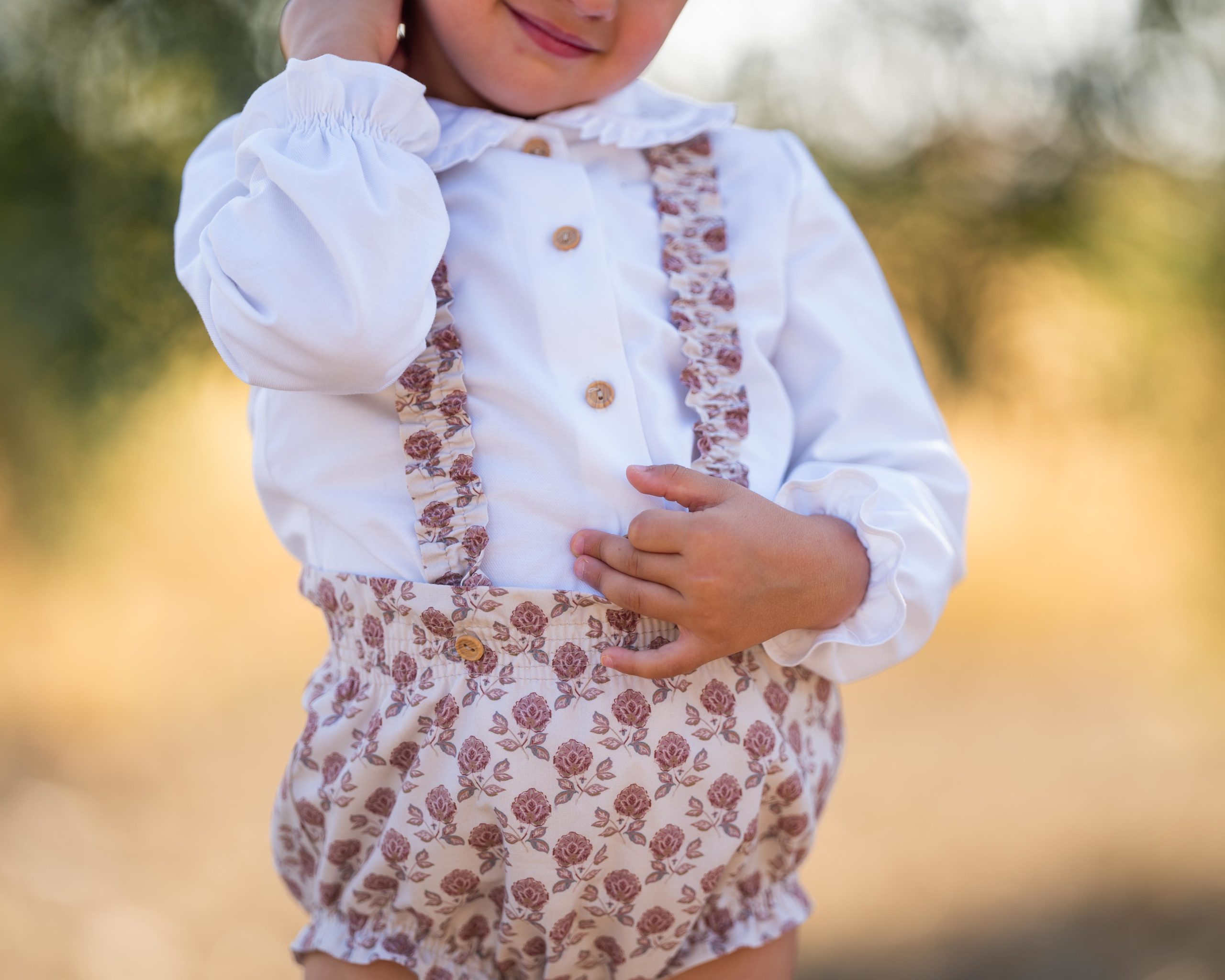 Culetín tirantes rizados engomados y extraíbles con 4 botones exclusivo estampado para Miji con tonos rosas y fondo nata.