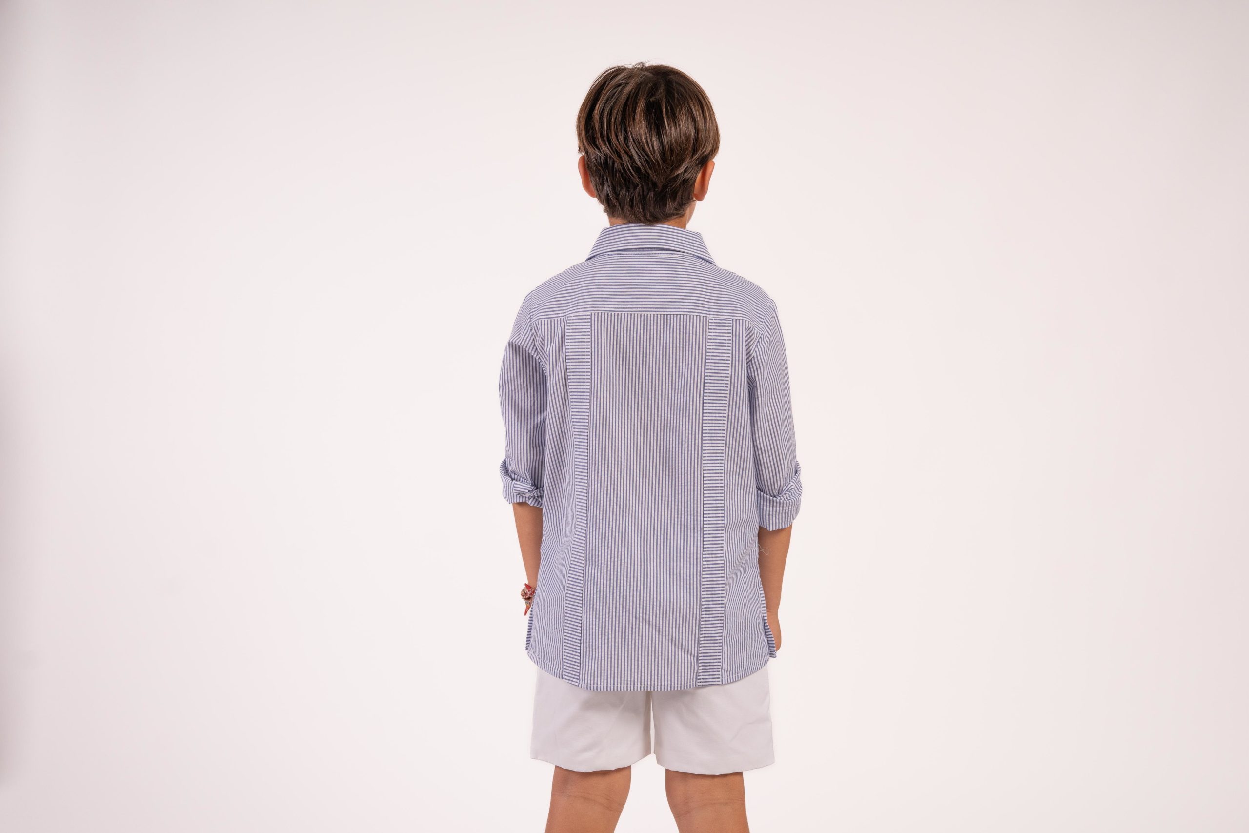 Camisa Guayabera en rayas azules con cuello italiano y cuatro bolsillos que la hacen irrestible.