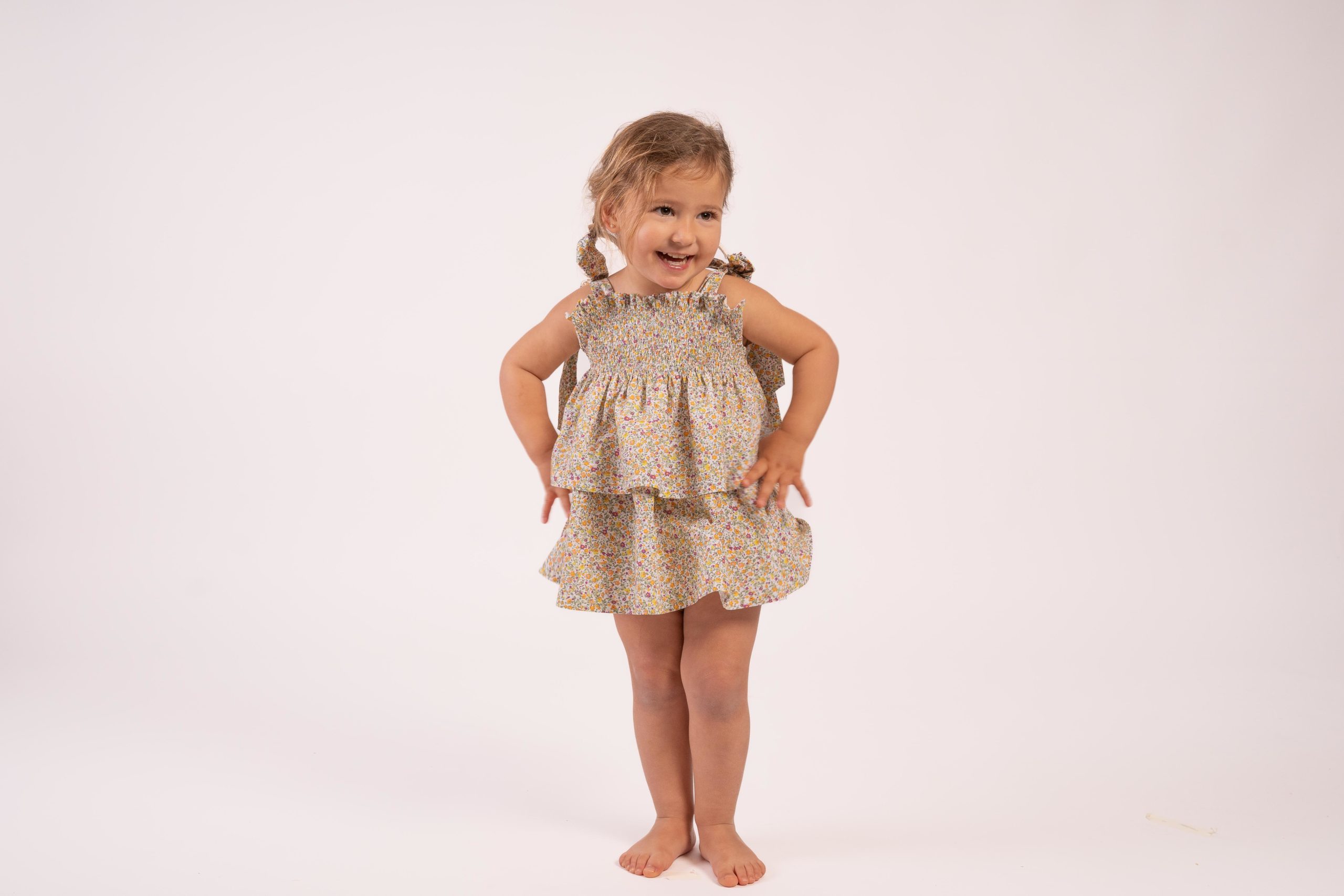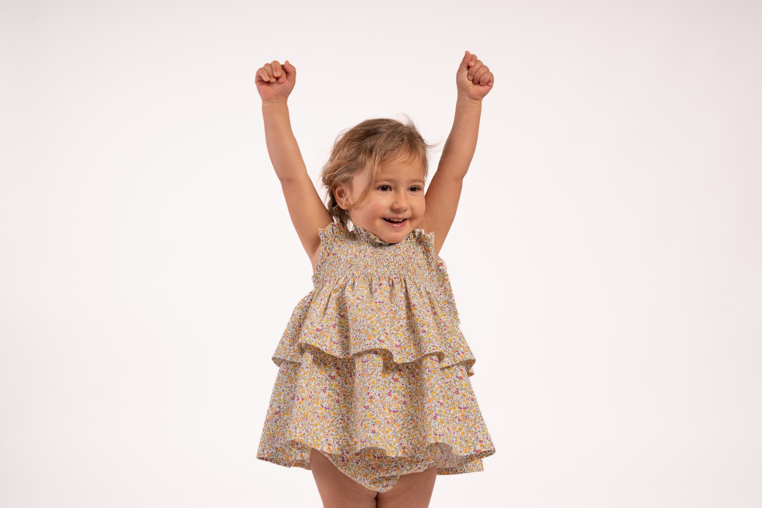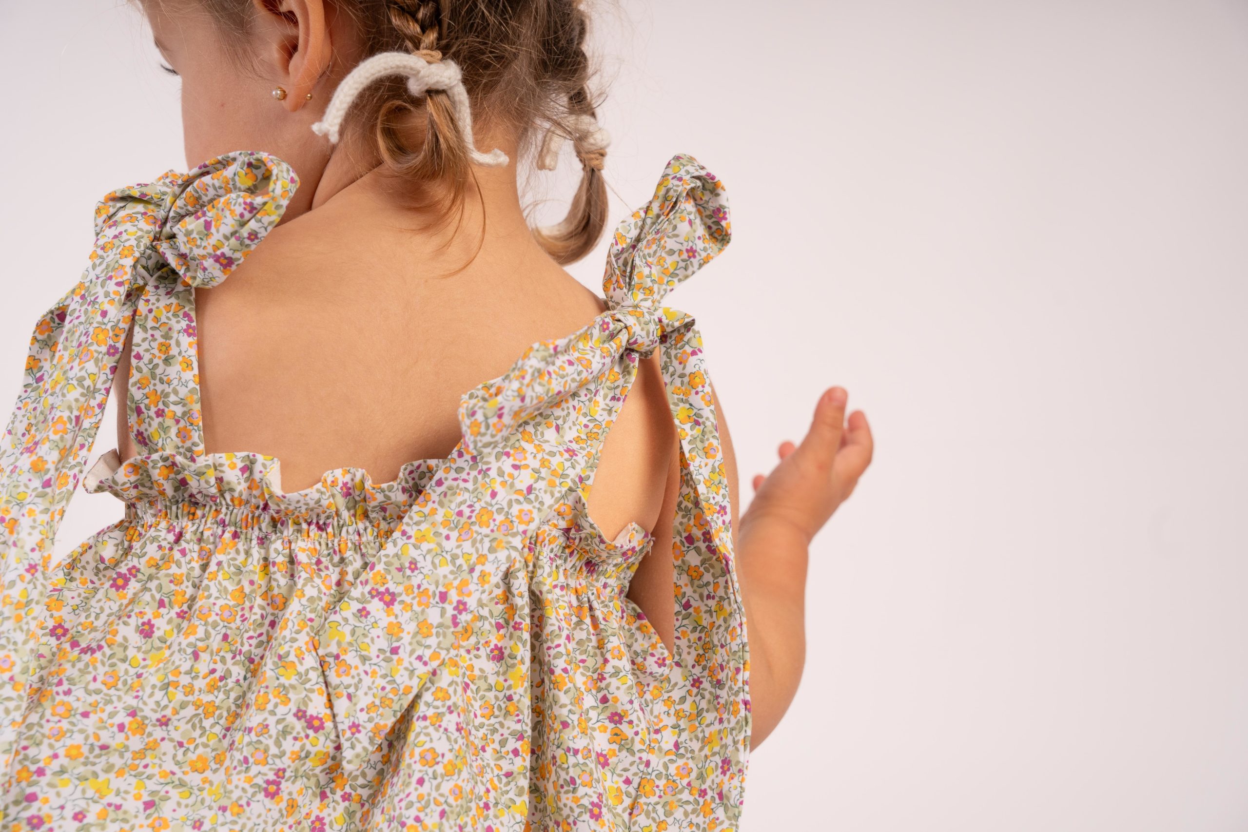 Jesusito de lazos con dos volantes en el cuerpo que lo hacen muy especial y veraniego. Tejido exclusivo para Miji de flores verdes, naranjas, amarillas y un toque lila.