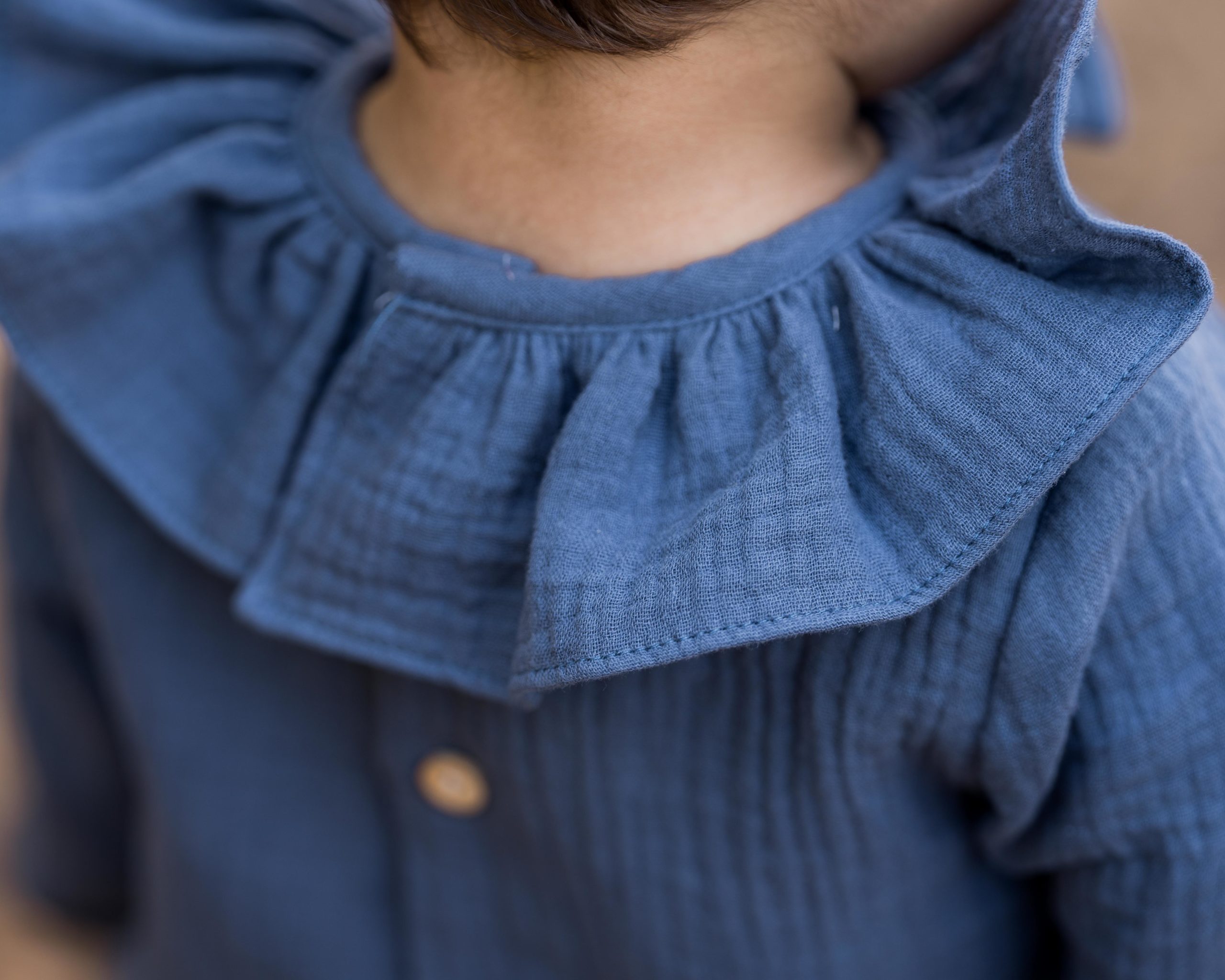 El pelele que no te debe faltar en tono azul de bambula con cuello volante confeccionado en tejido bambula.