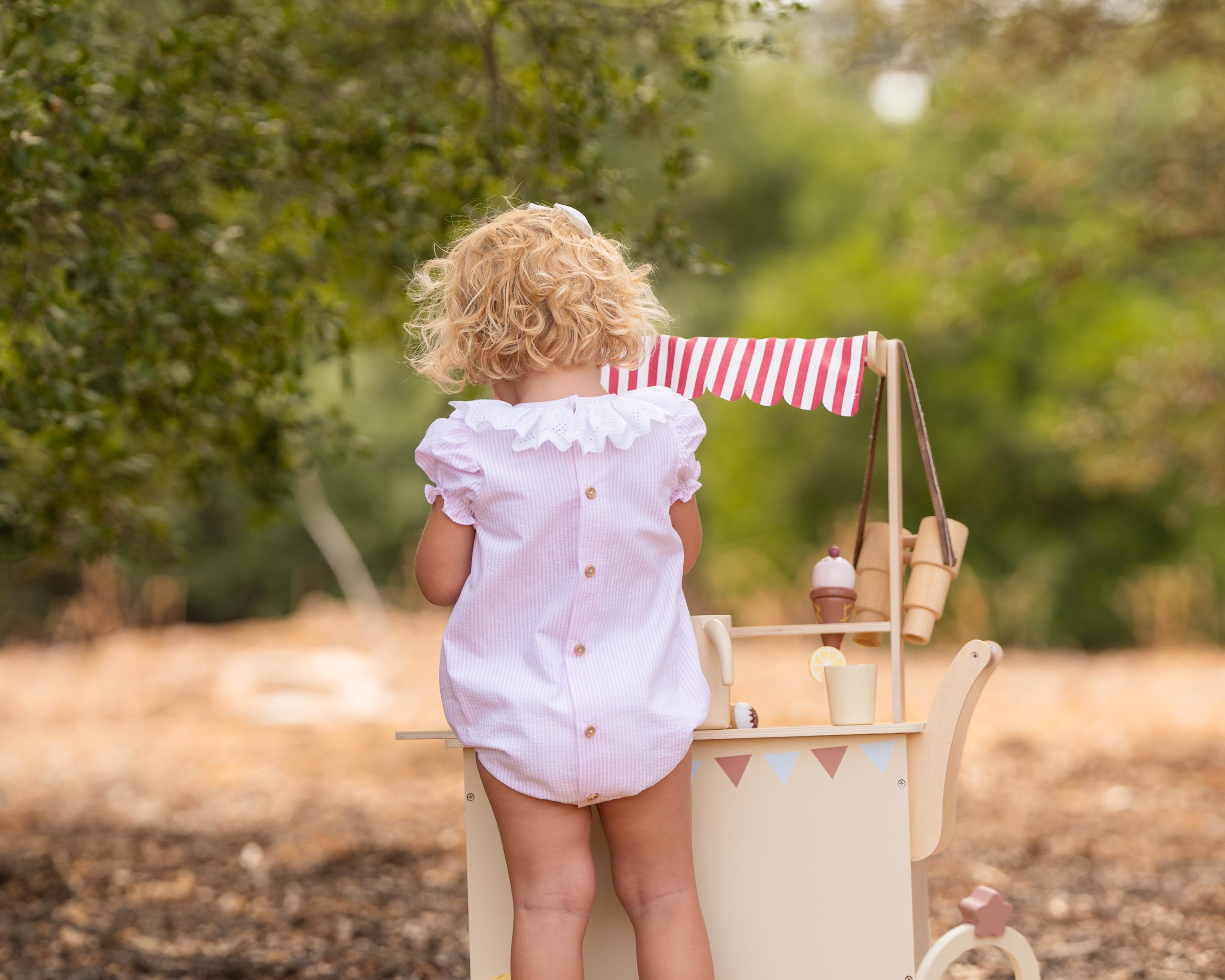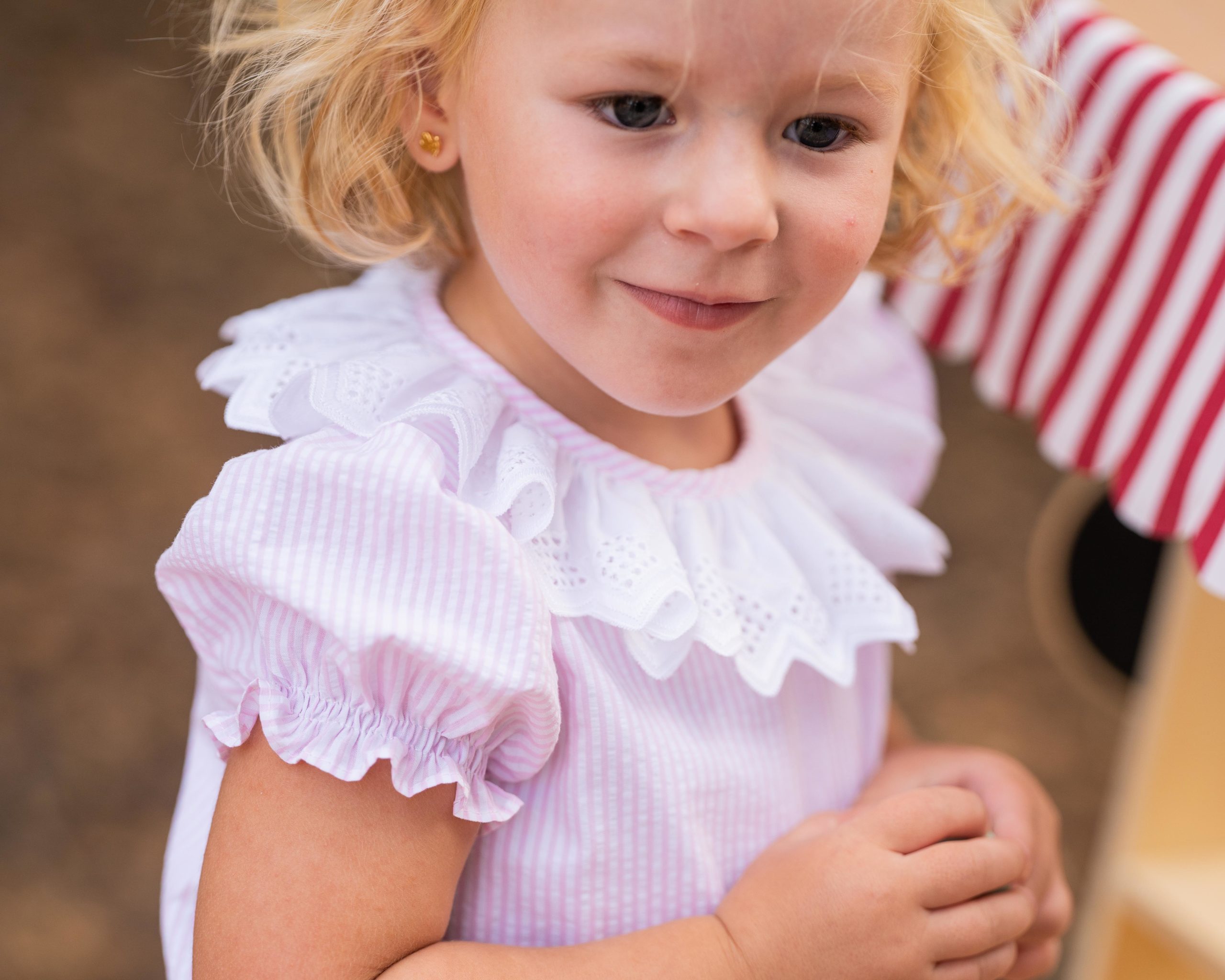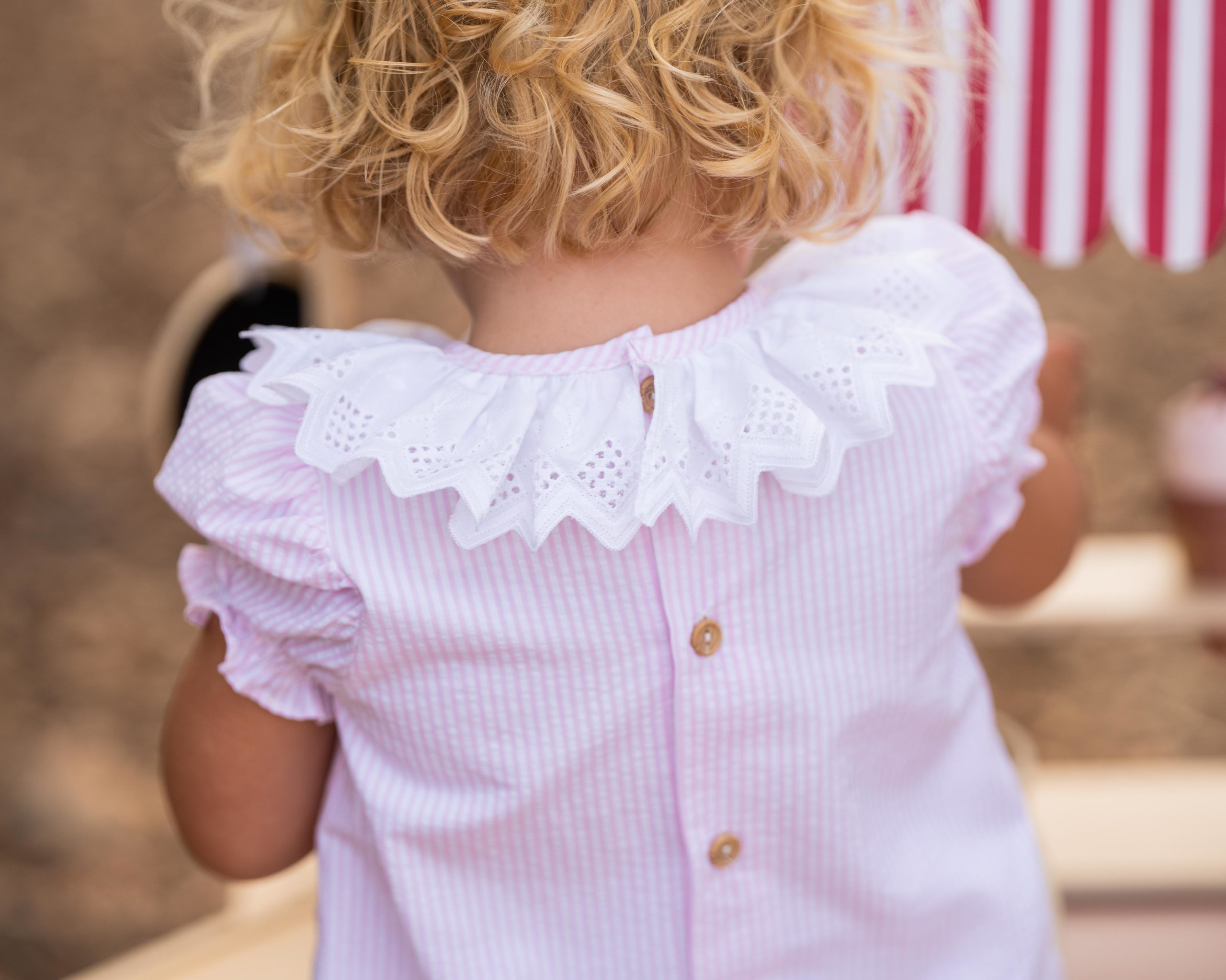 Pelele básico de manga corta de rayas rosas con cuello de tira bordada súper especial. Un look elegante y veraniego para nuestros bebés.