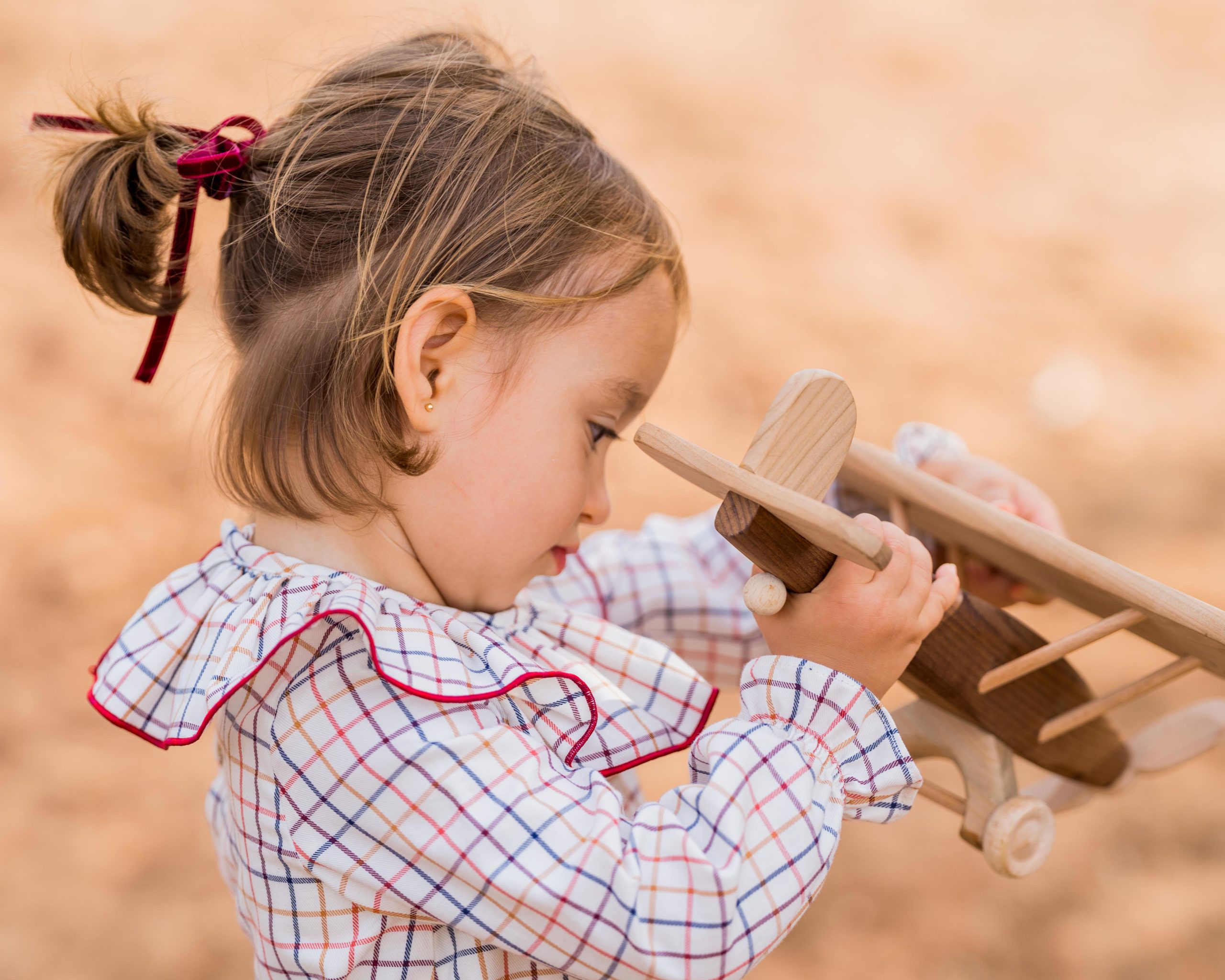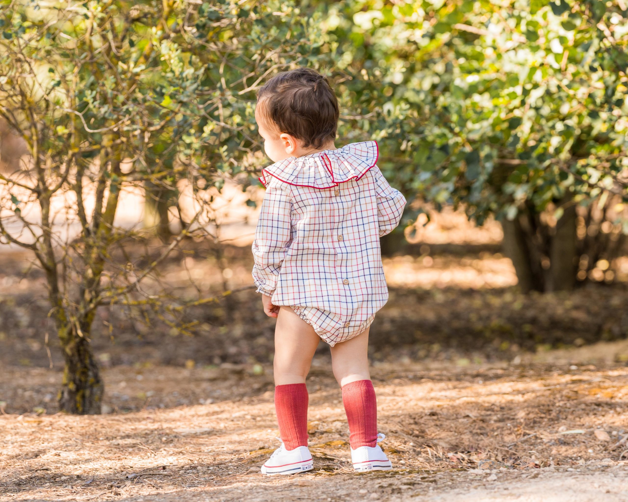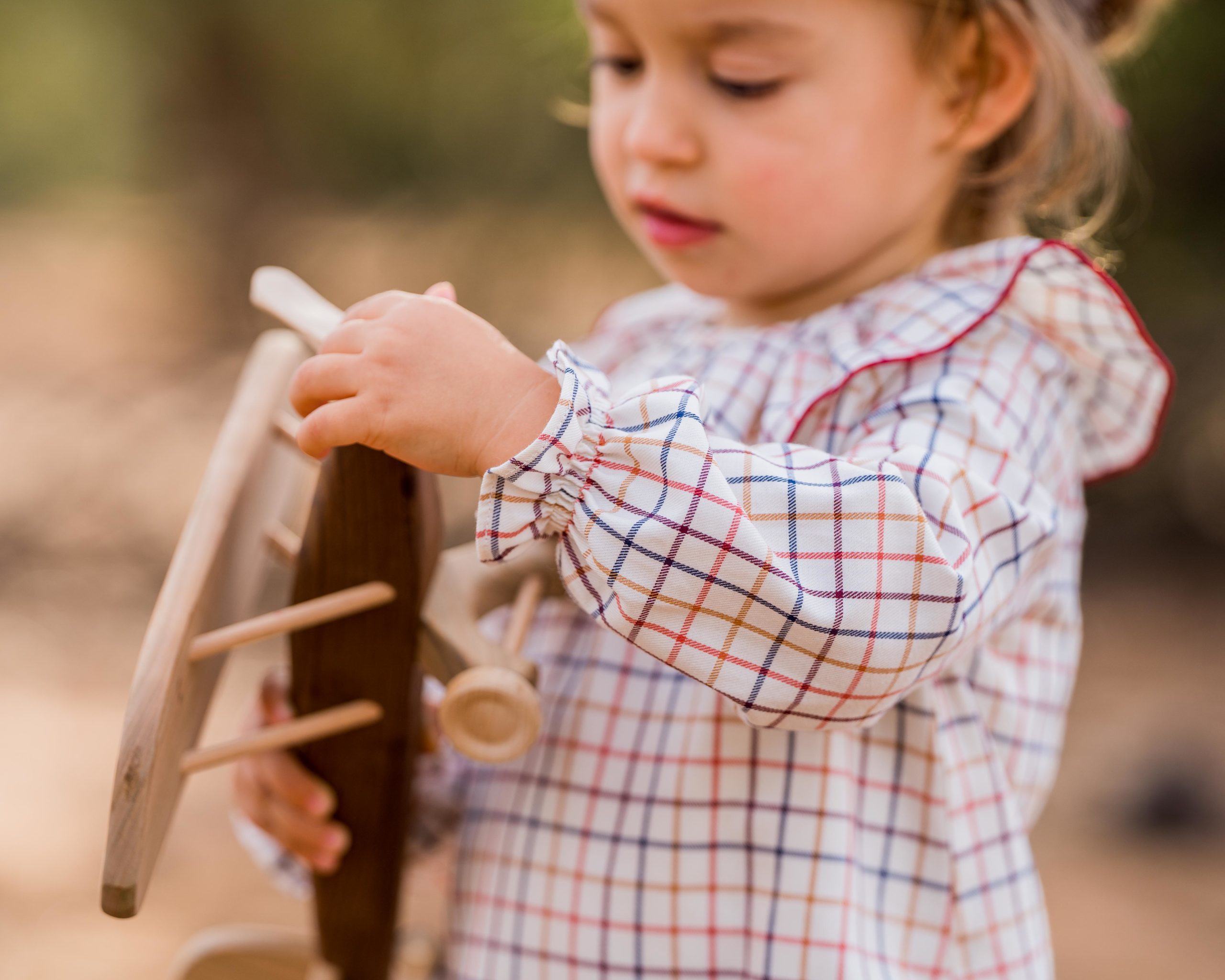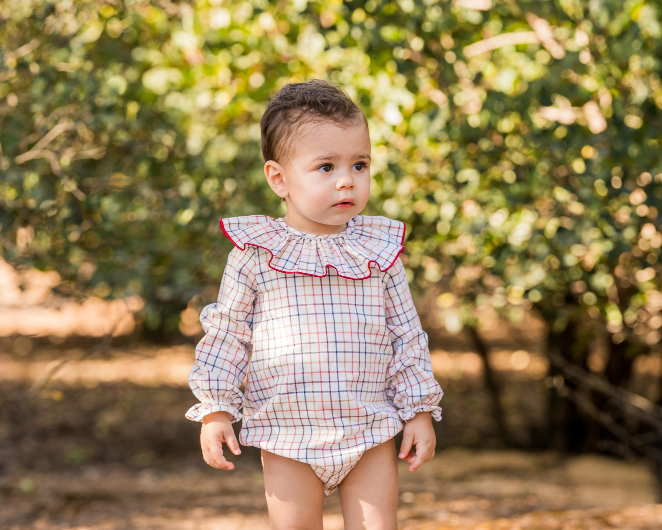 Pelele con cuello volante con repulgo granate, cuadros en tejido villela muy suave de colores azules, granates y mostaza.