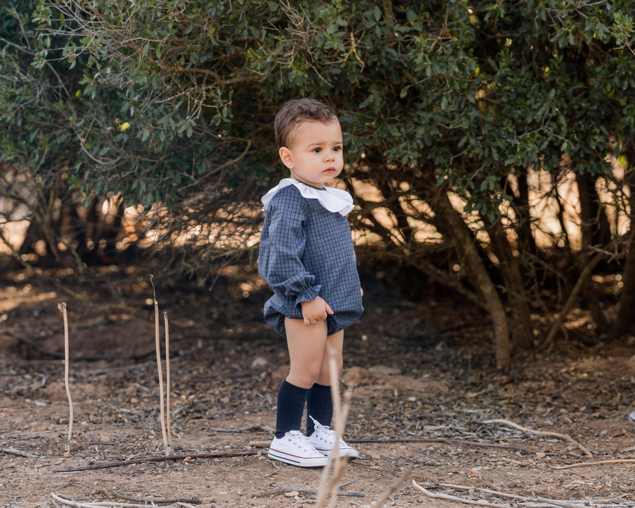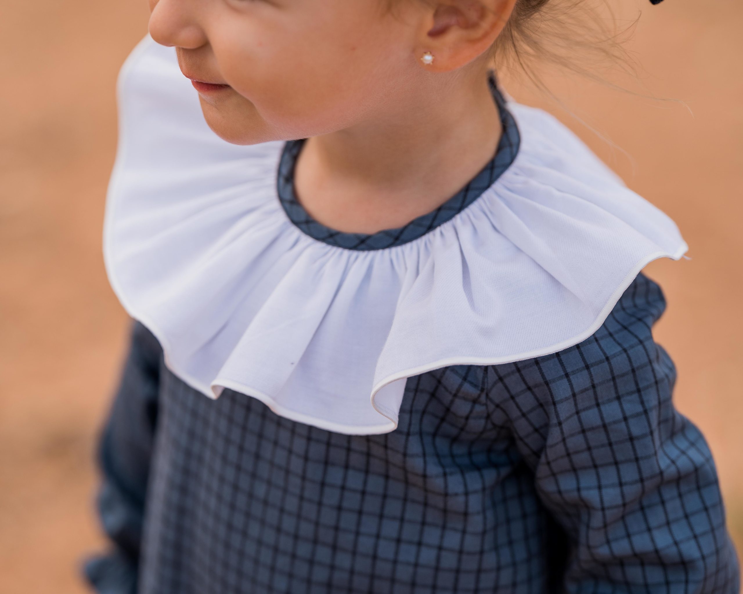 ideal pelele con cuello volante villela blanca y cuerpo en tejido cuadros azul y negros.