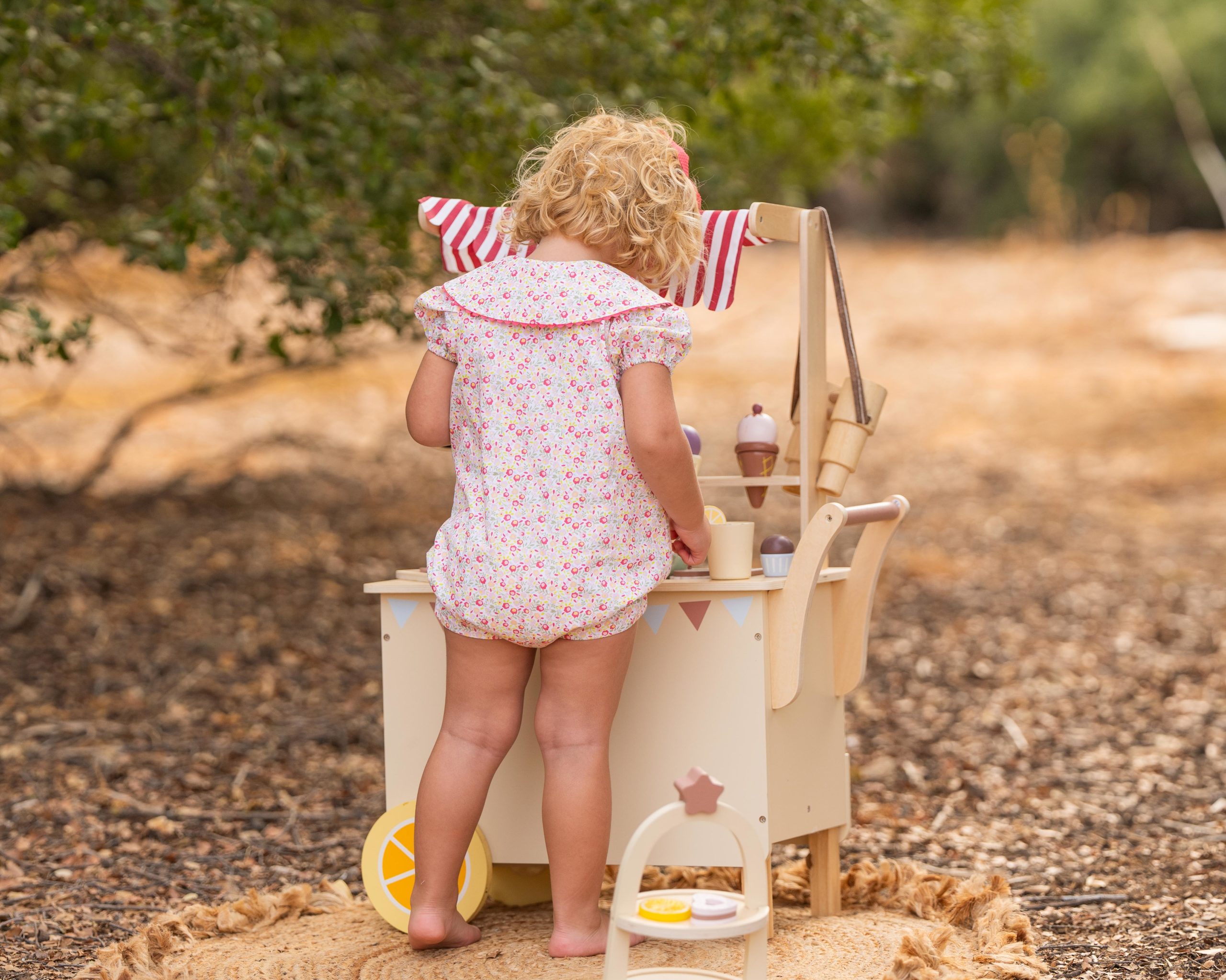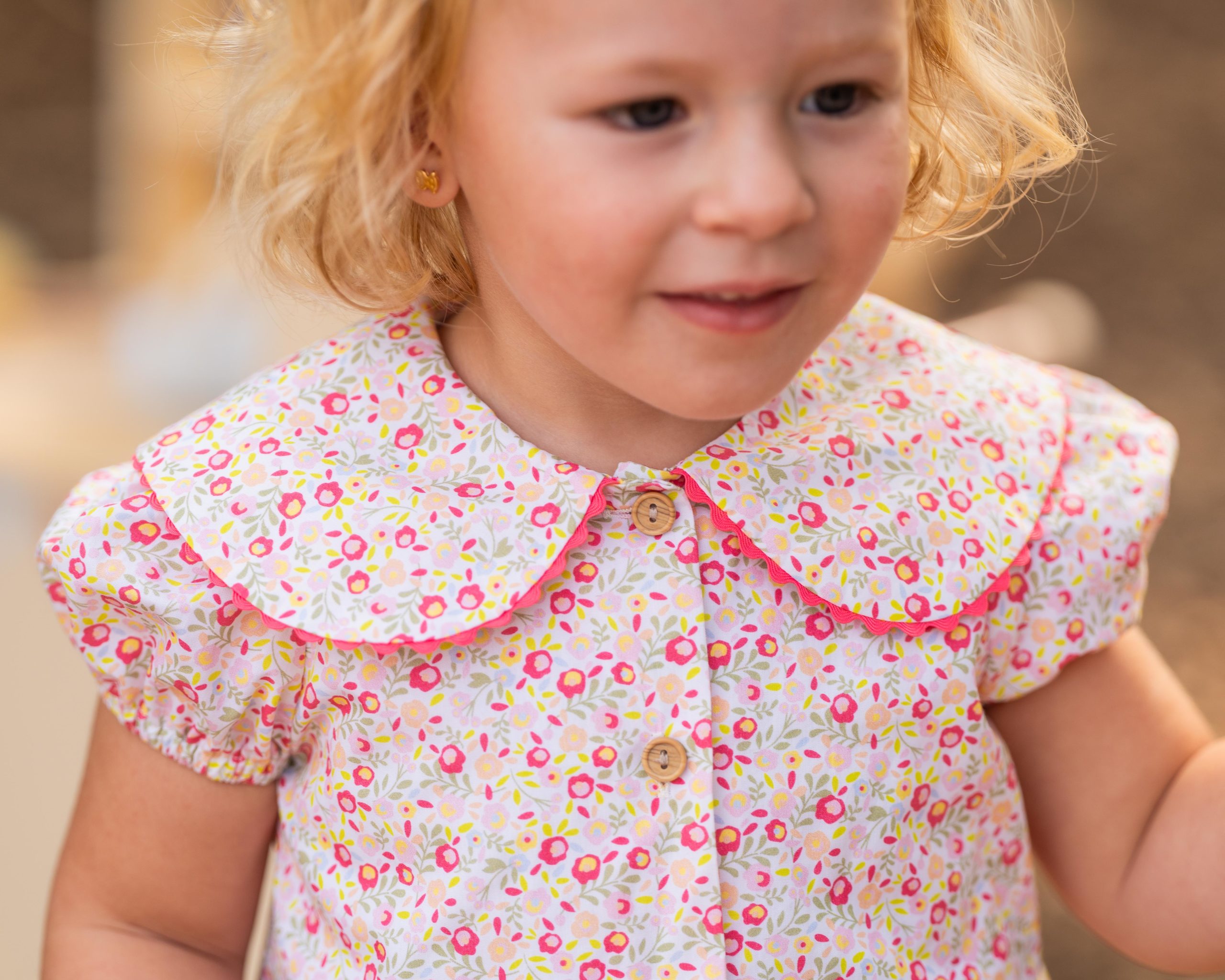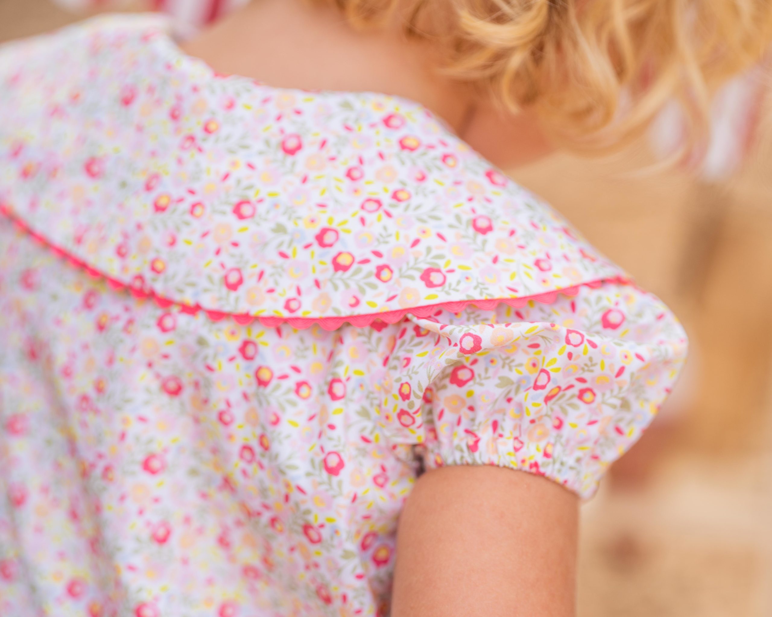 Pelele de manguita corta con cuello bobo acabado en ondulina flúor. Tejido exclusivo para Miji de flores rosas, amarillas, azules y toques flúor.