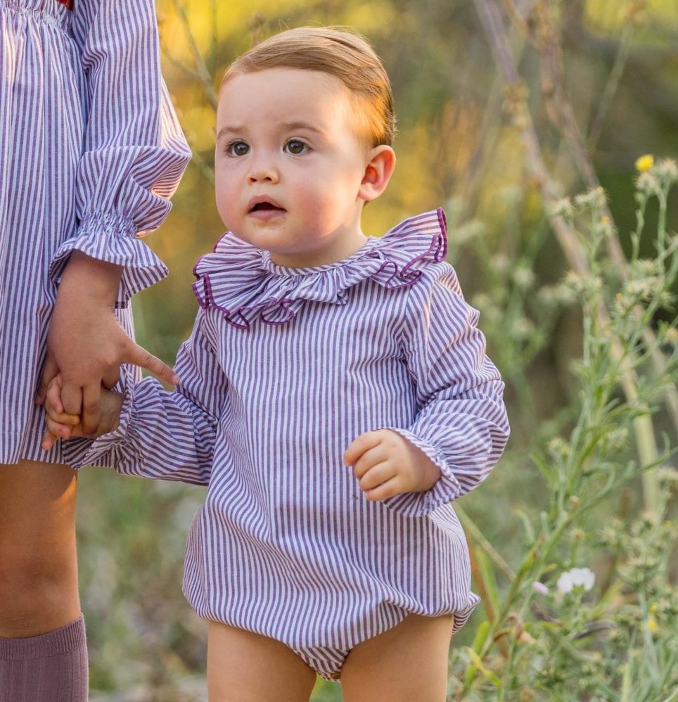 Pelele de manga larga rayas berenjena oxford, un look elegante y favorecedor para nuestros bebés.