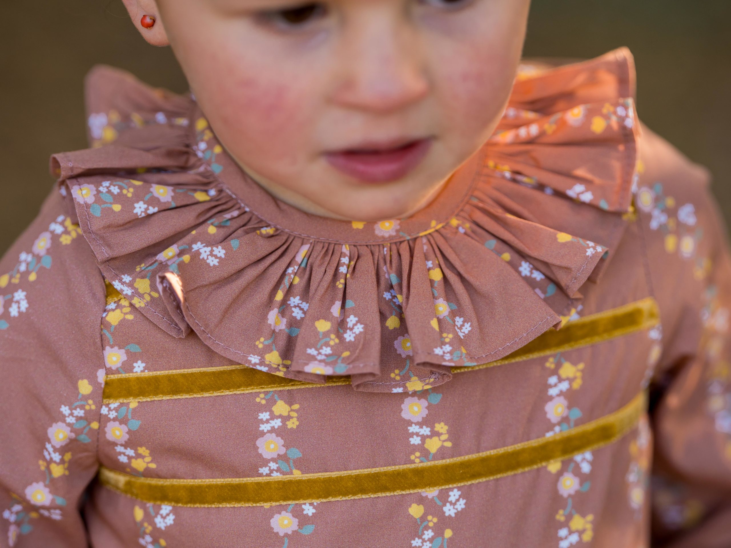 Ideal pelele con cuello volante y pecherIn fruncido con cintas de terciopelo en EXCLUSIVO estampado para Miji de flor en línea.