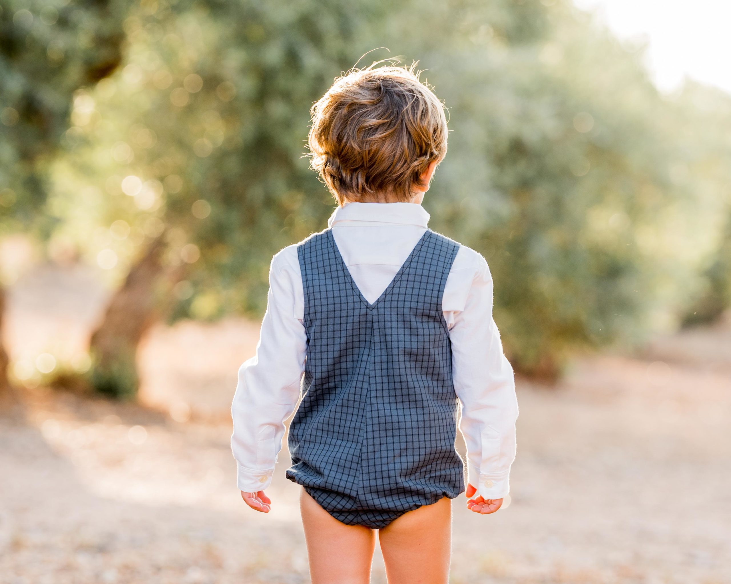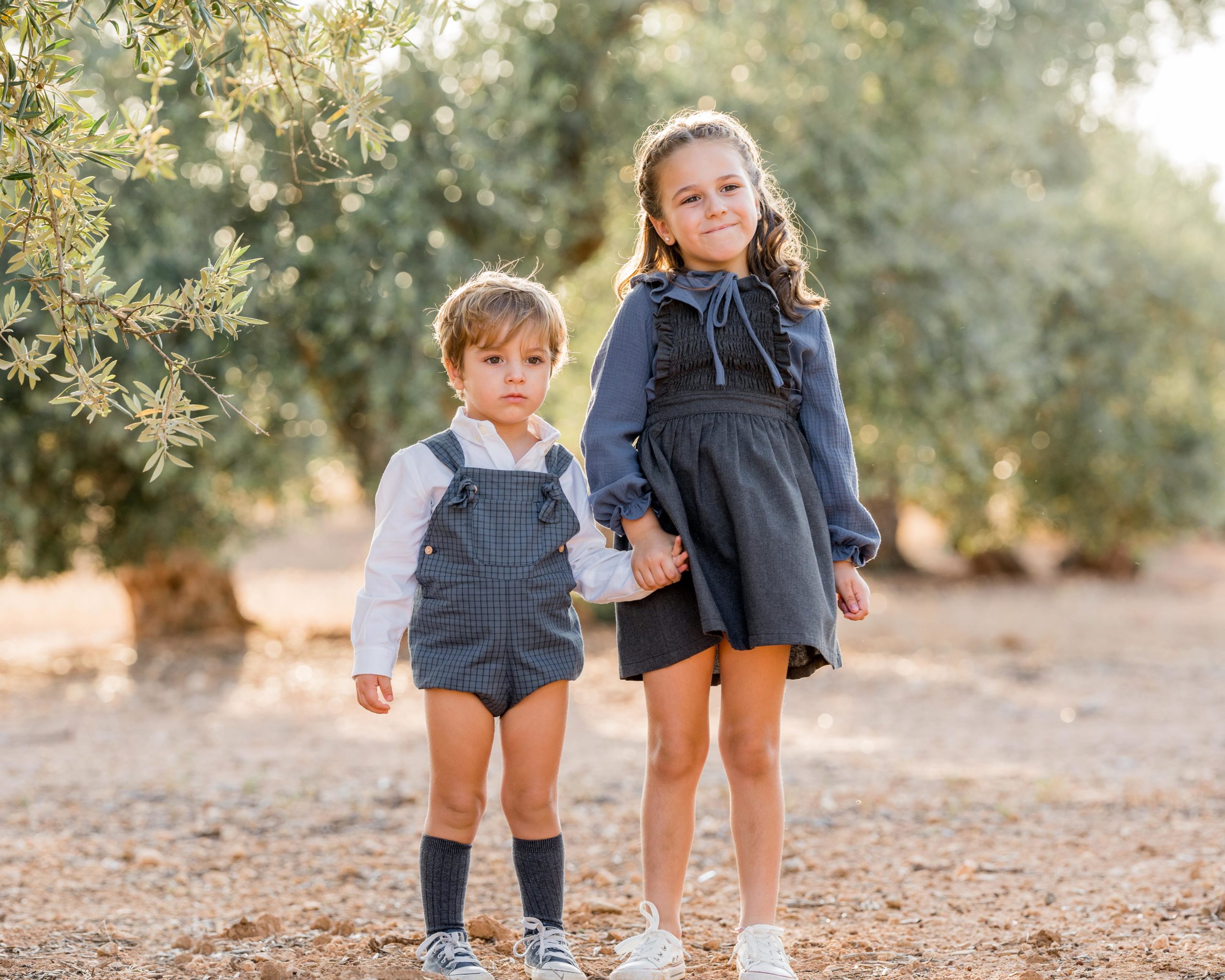 Peto bombacho con bolsillo delantero, se regula con nuditos en tejido cuadros azul y negros.