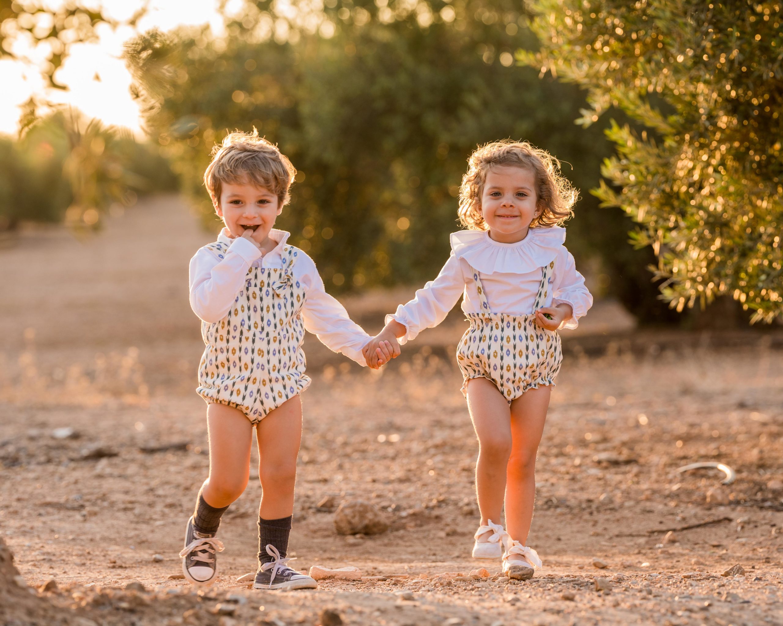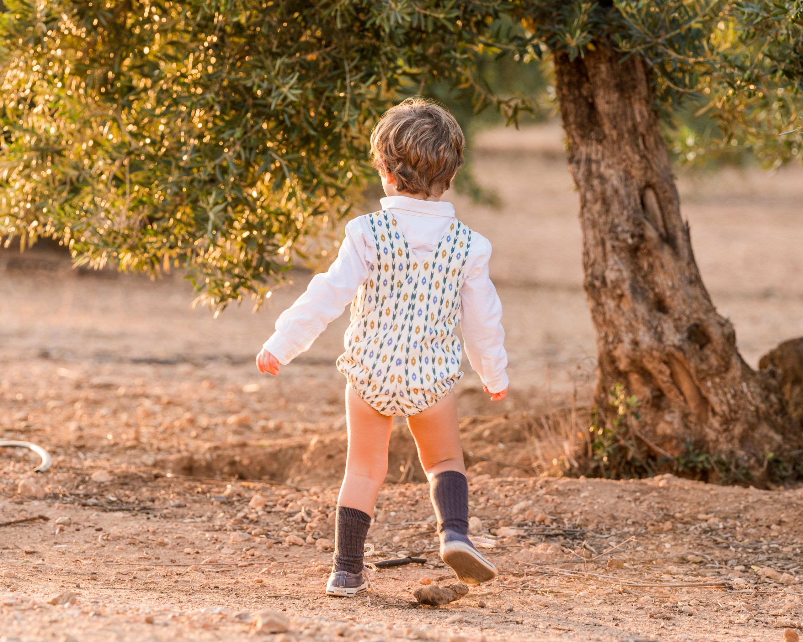 Peto bombacho con bolsillo delantero, se regula con nuditos con tejido exclusivo para Miji con motivos étnicos en colores oliva suave, azul y verde.