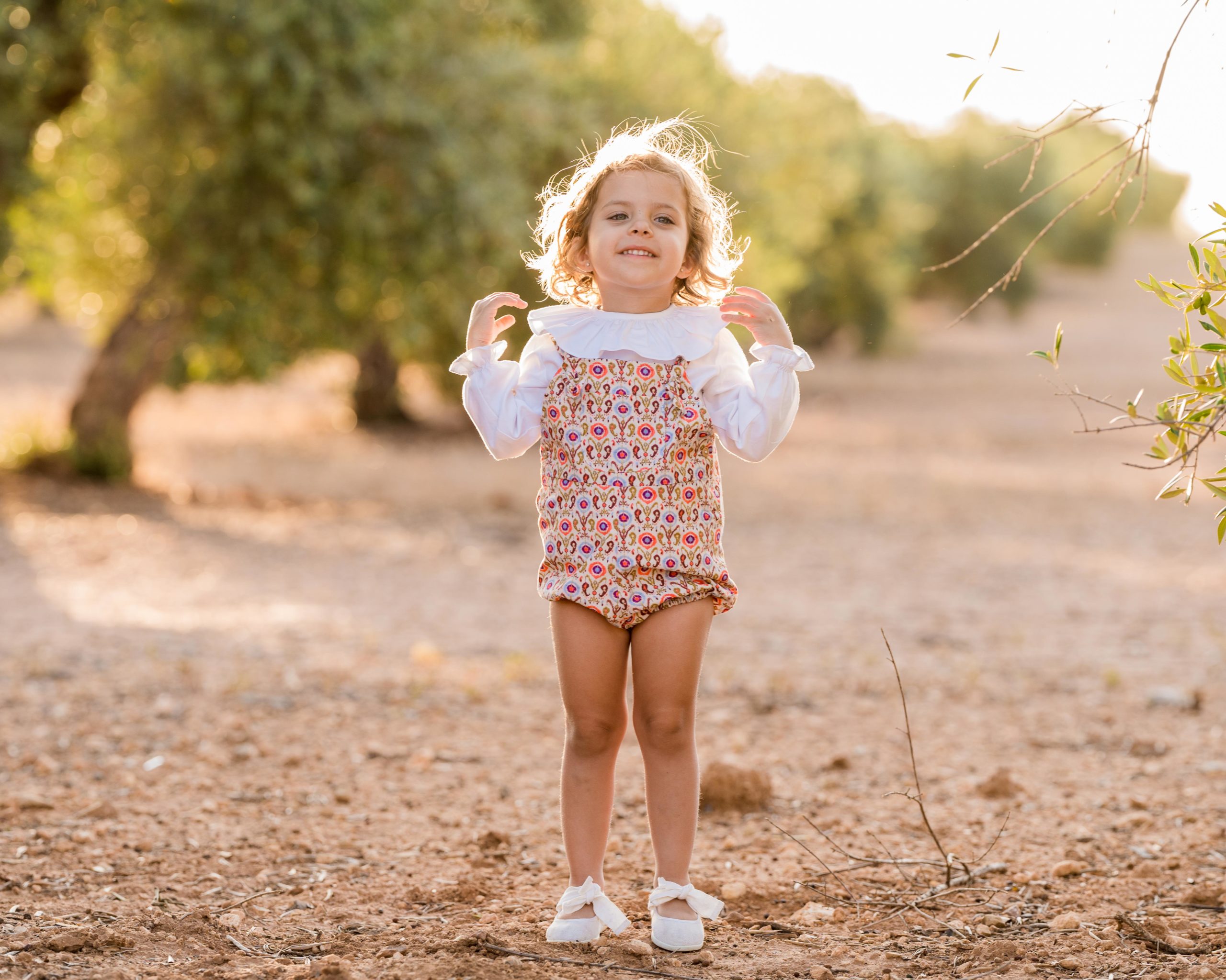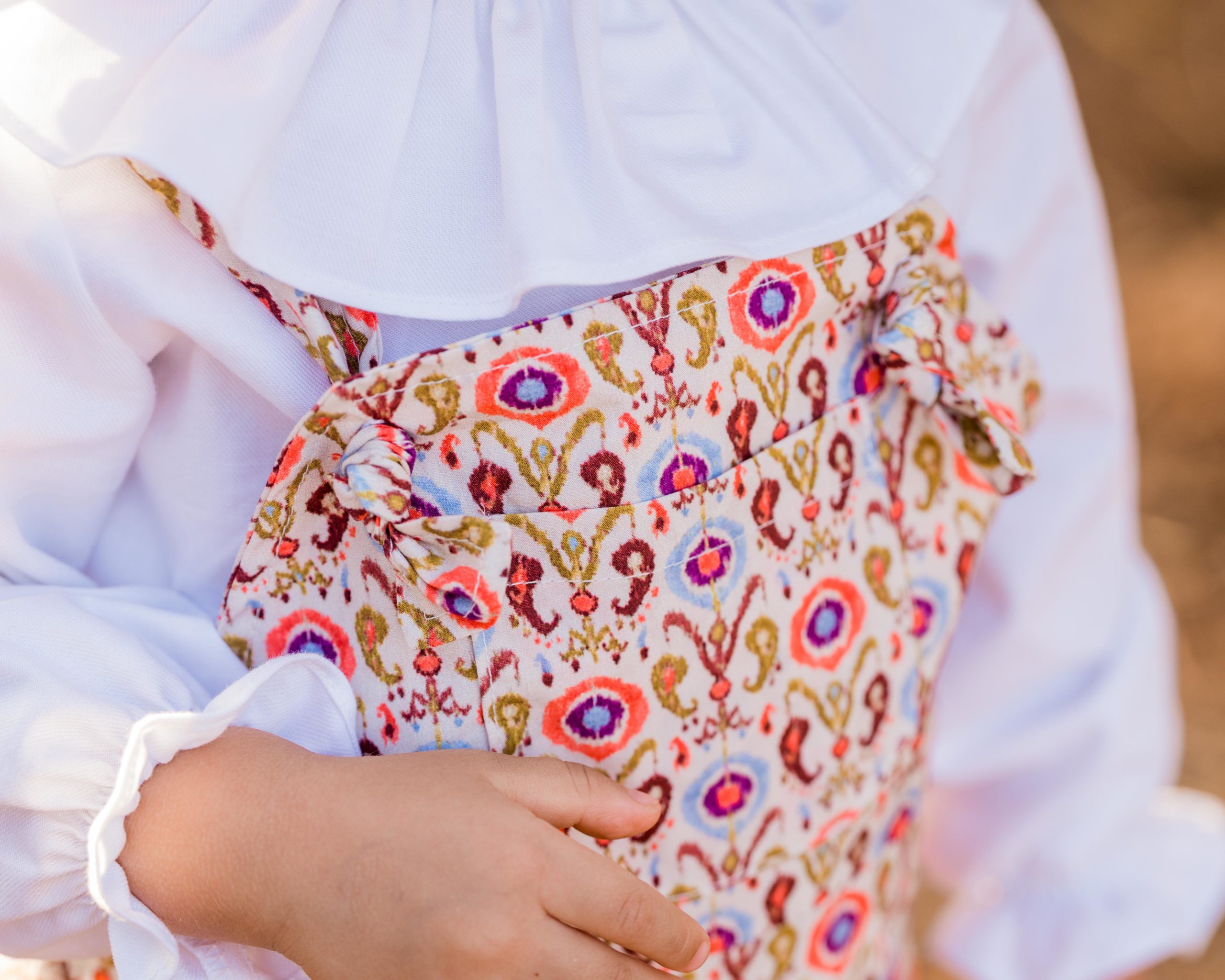 Peto bombacho con bolsillo delantero, se regula con nuditos tejido exclusivo para Miji con motivos étnicos en colores rosa coral, azulina, oliva suave y granate.