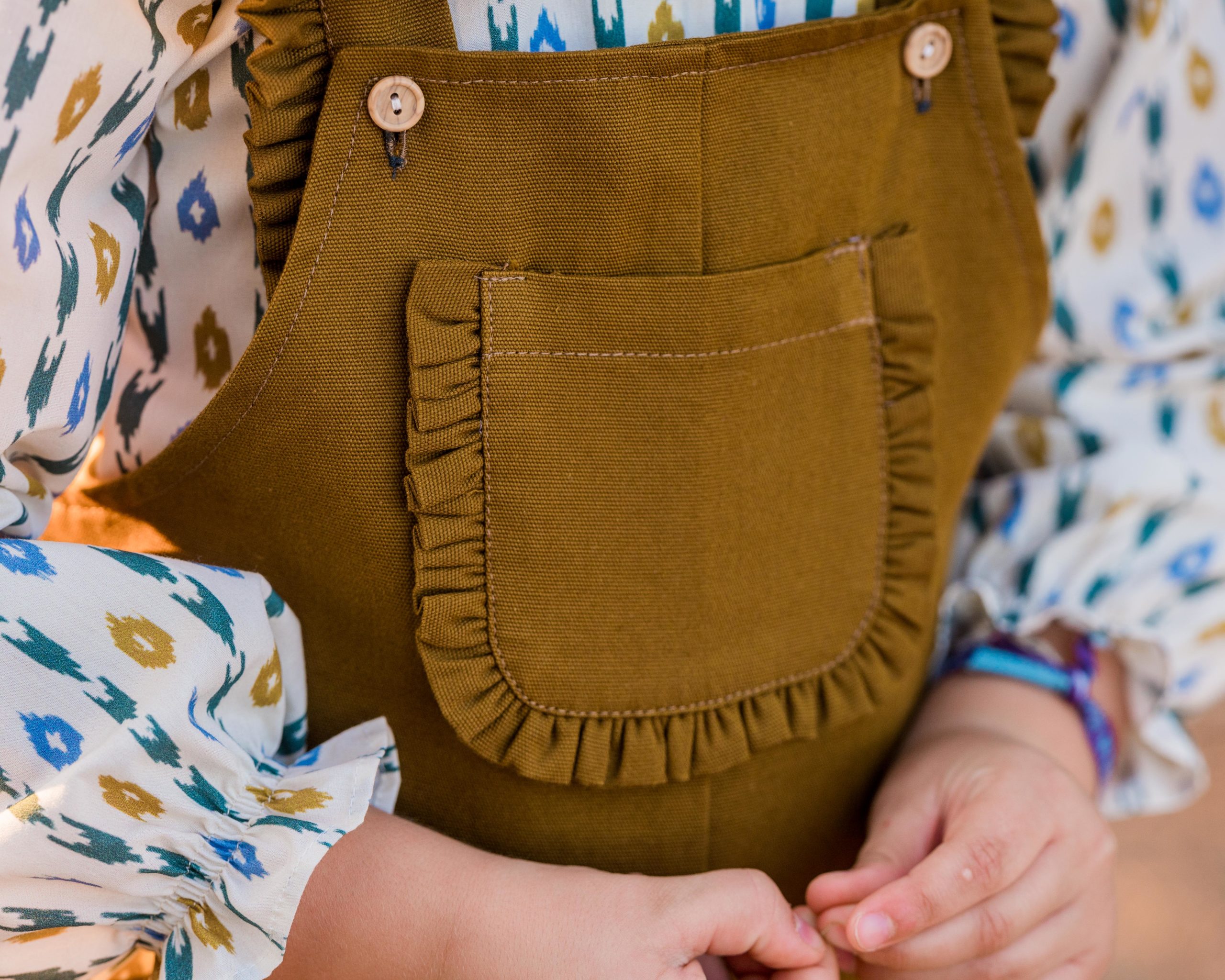 Peto con bolsillo delantero con volantito y detalle de volante en tirantes.