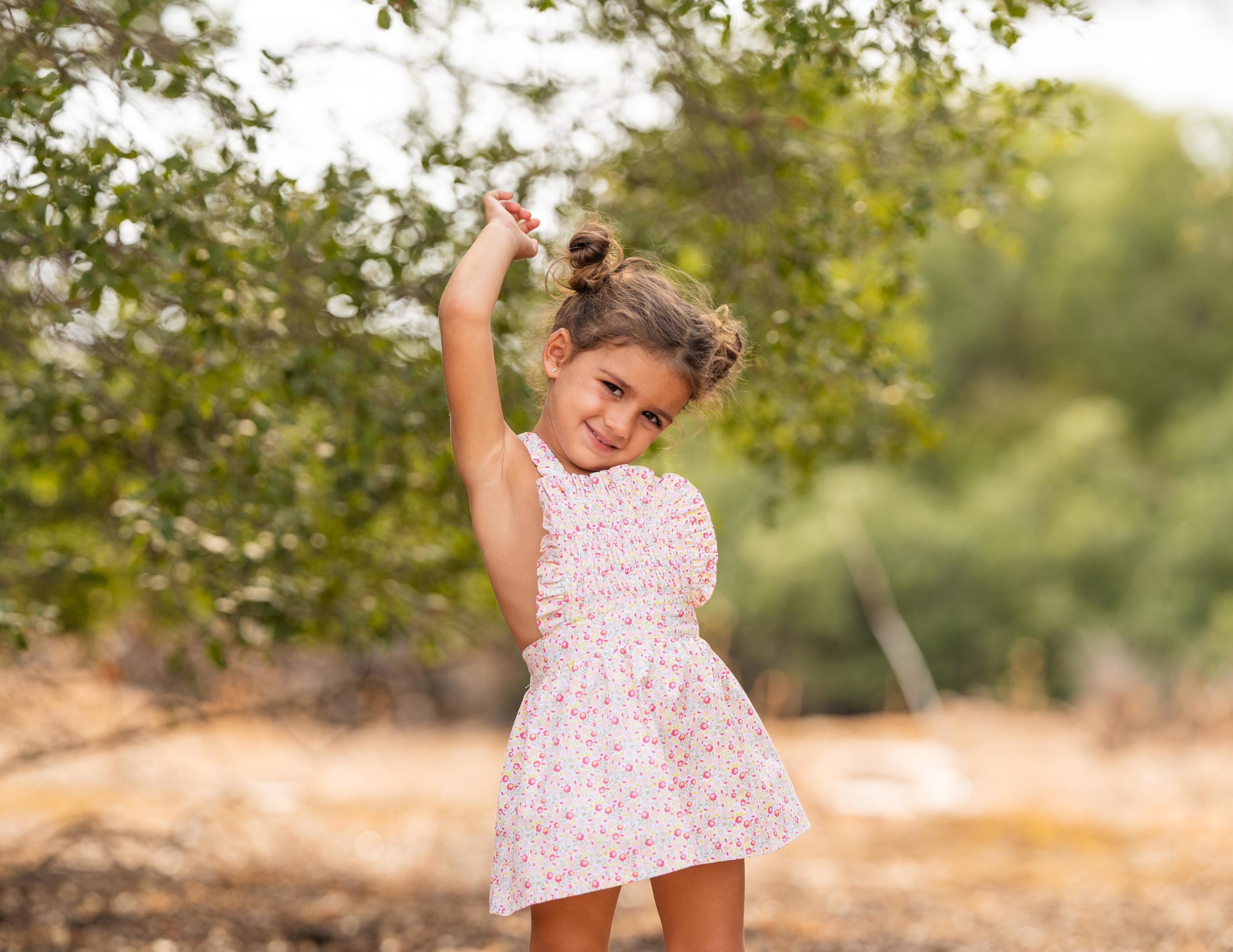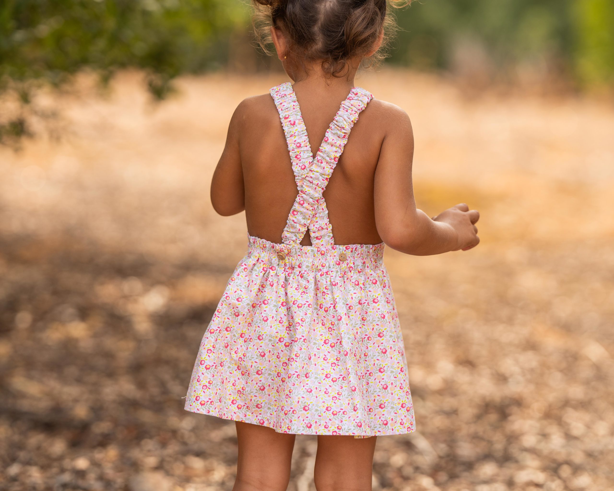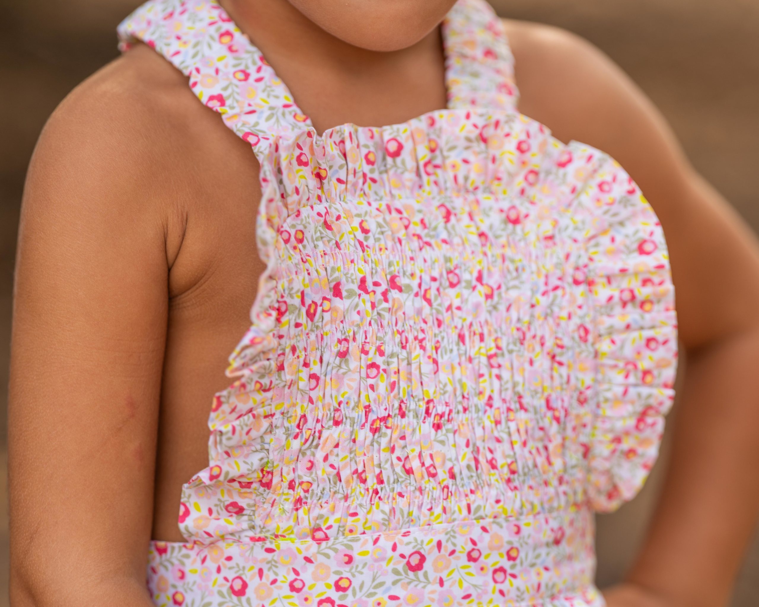 Ideal pichi con detalle en pecherin engomado con volantito confeccionado, en estampado exclusivo para Miji con flores rosas, verdes, amarillas y un toque flúor.