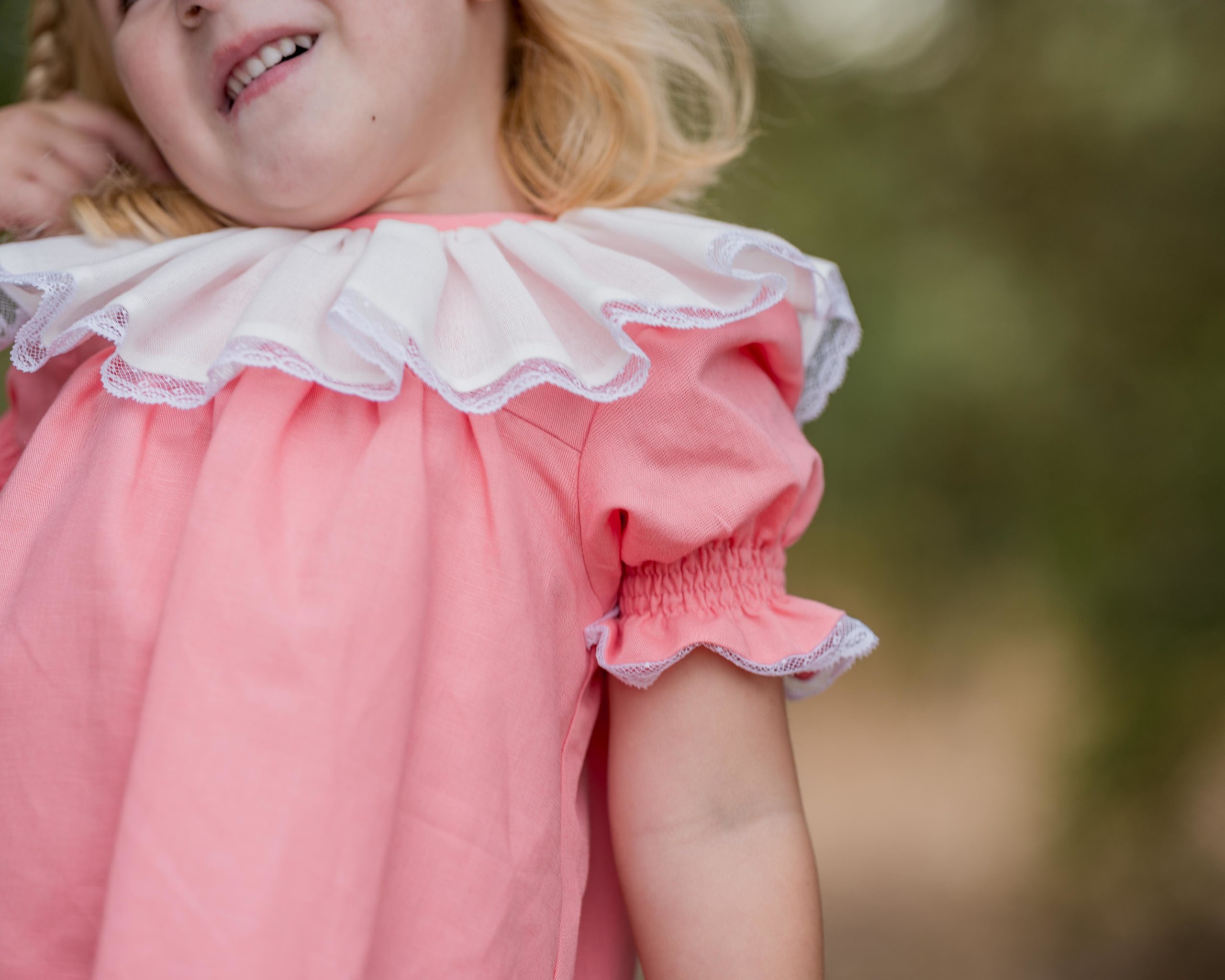 Vestido de lino en tono coral asalmonado con cuello volante baberola y terminación con encaje valencia.