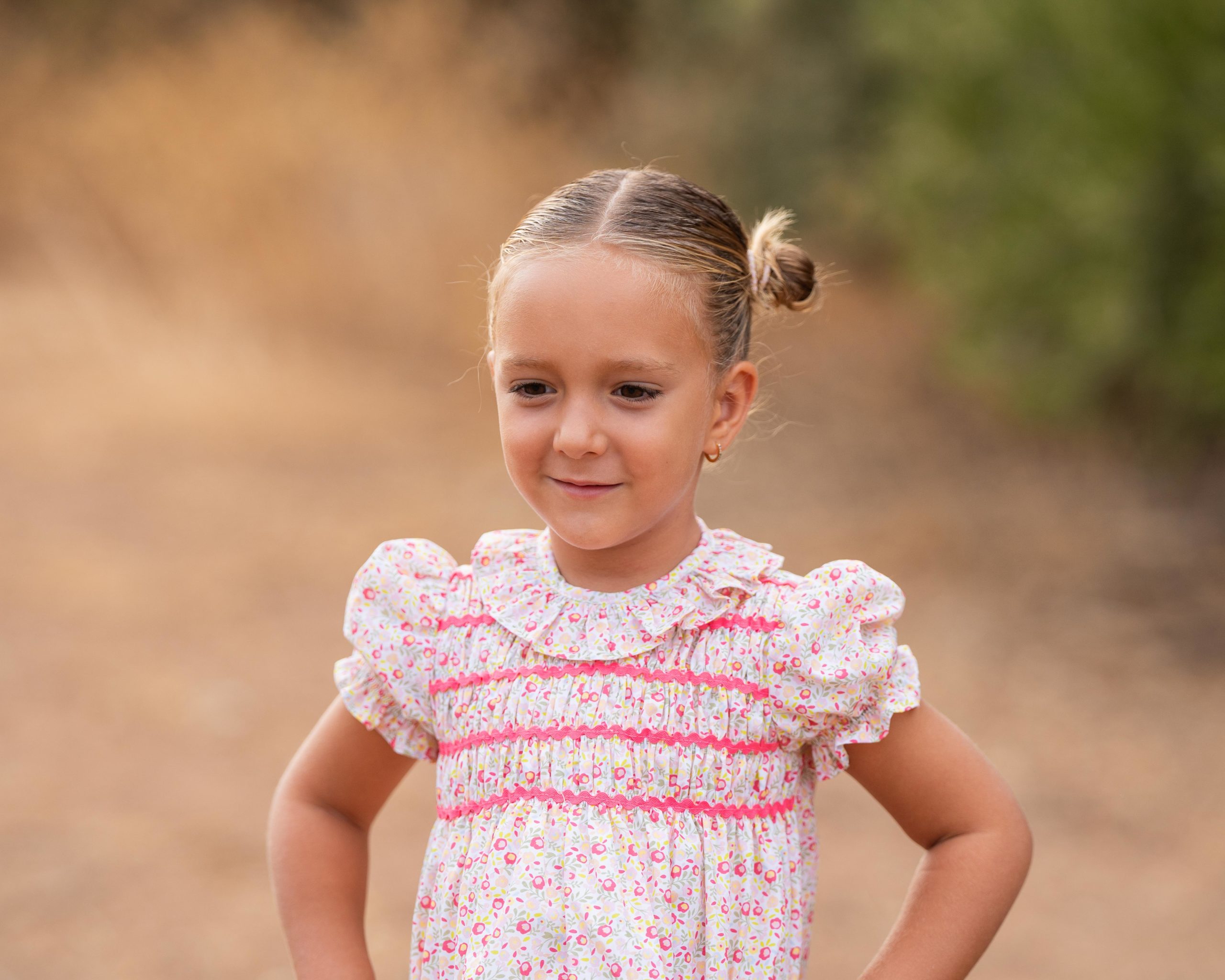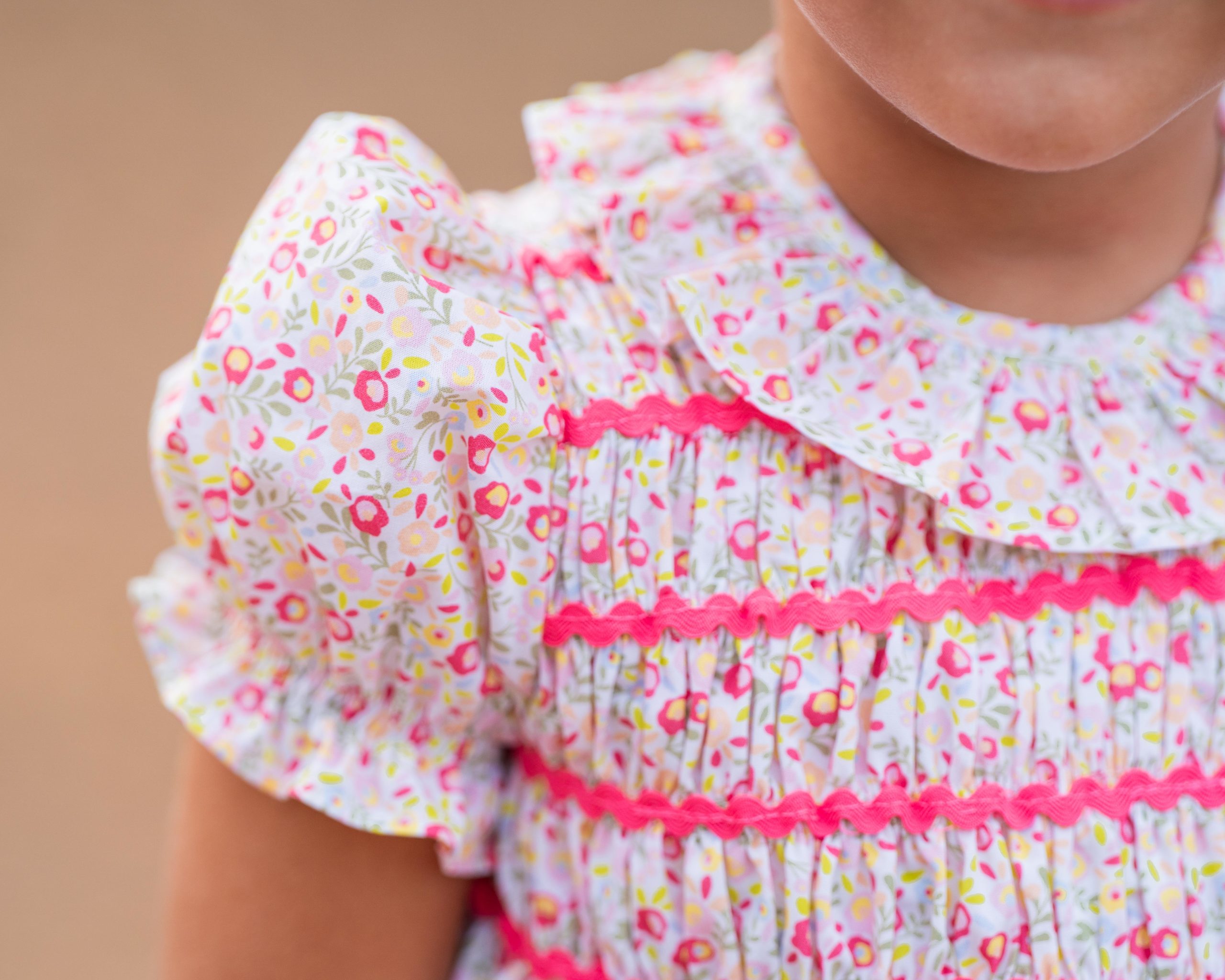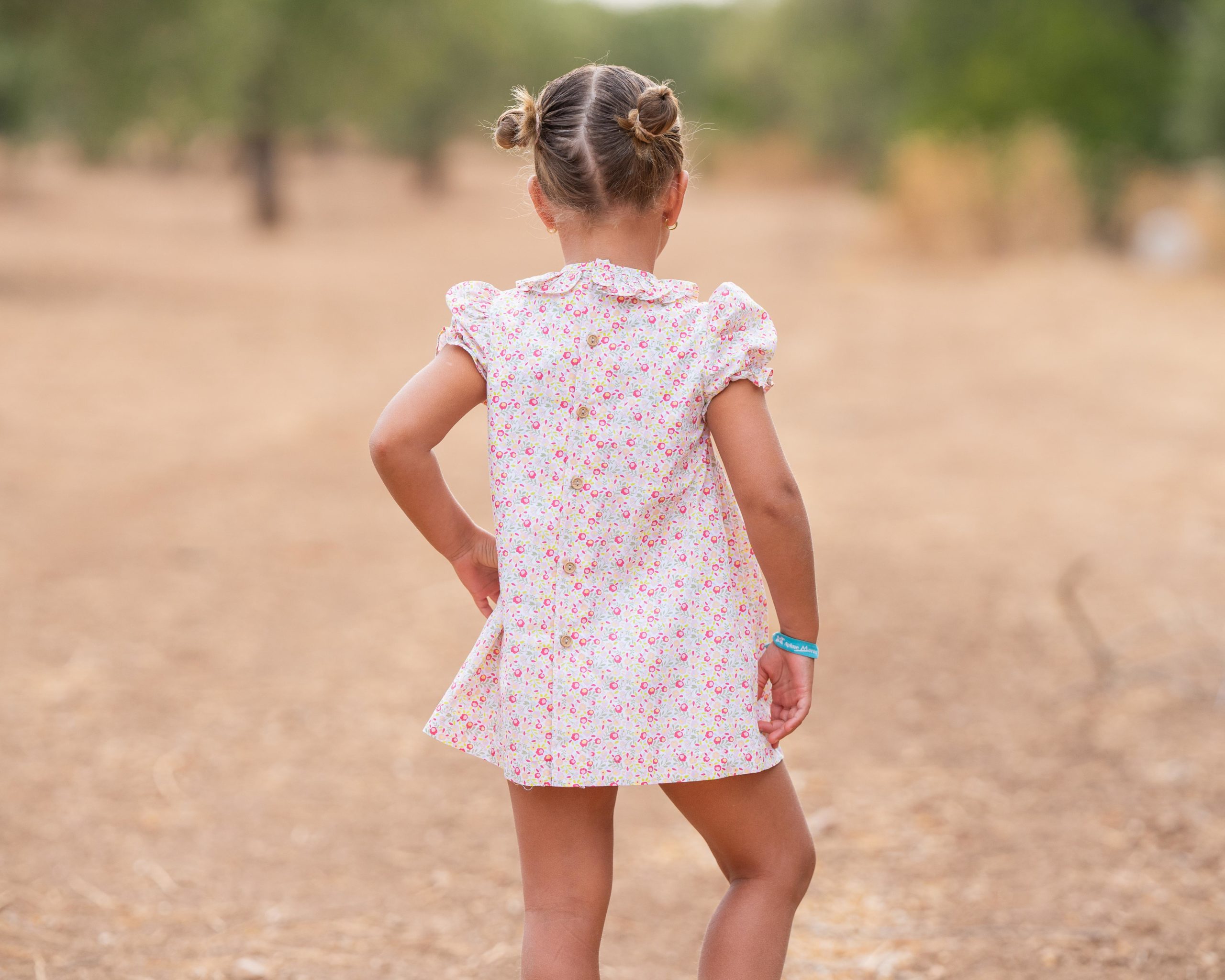 Maravillo vestido de manguita farol con su pecherín engomado con ondulina rosa flúor y cuello volante que lo hacen especial. Tejido exclusivo para Miji.