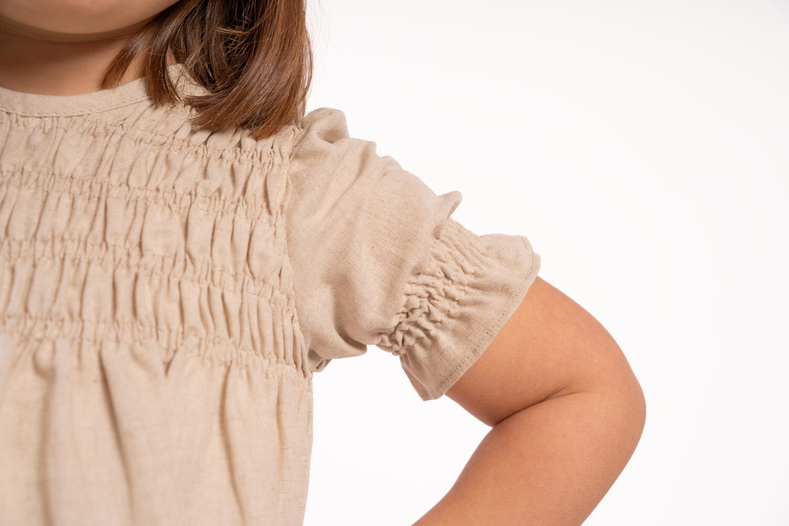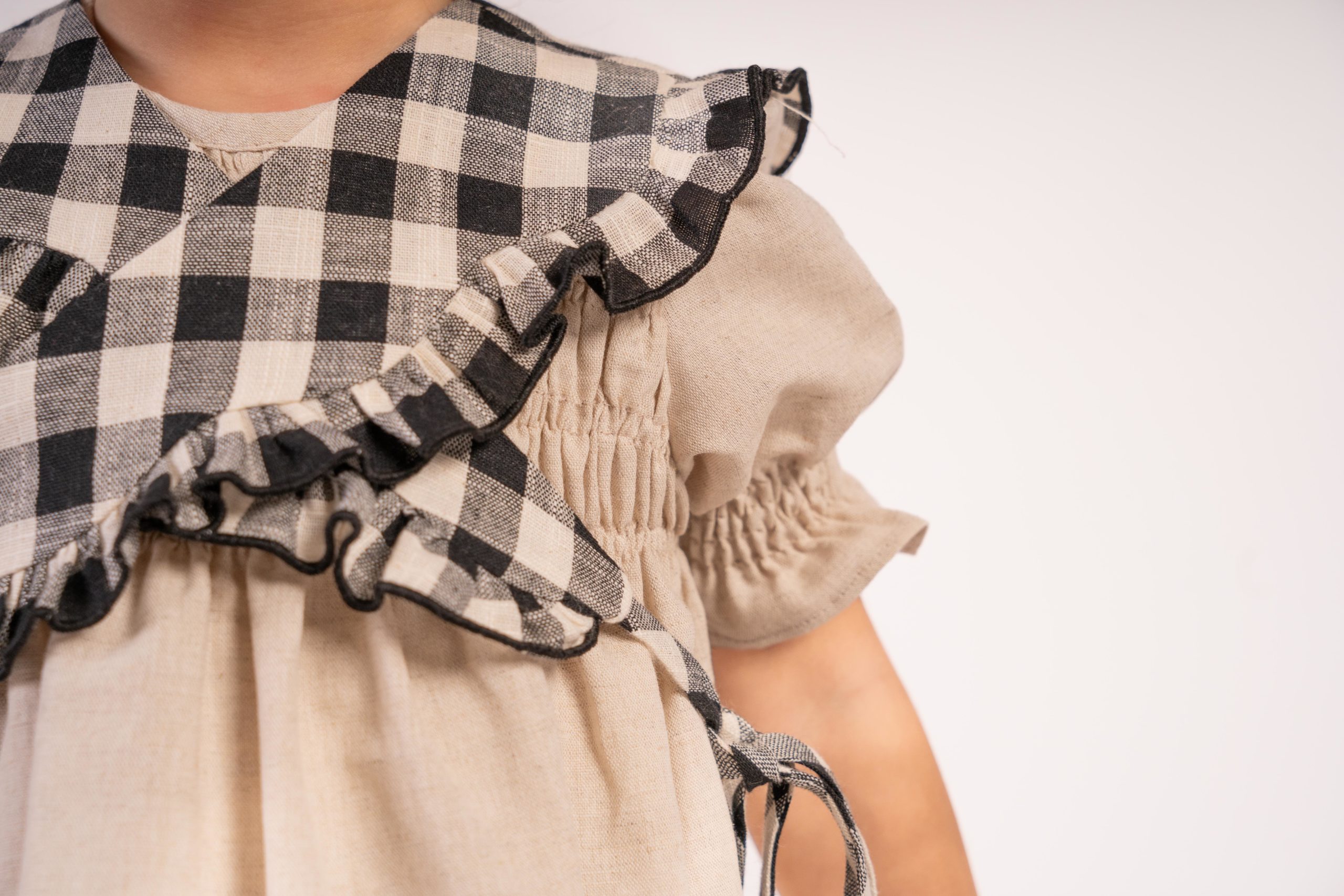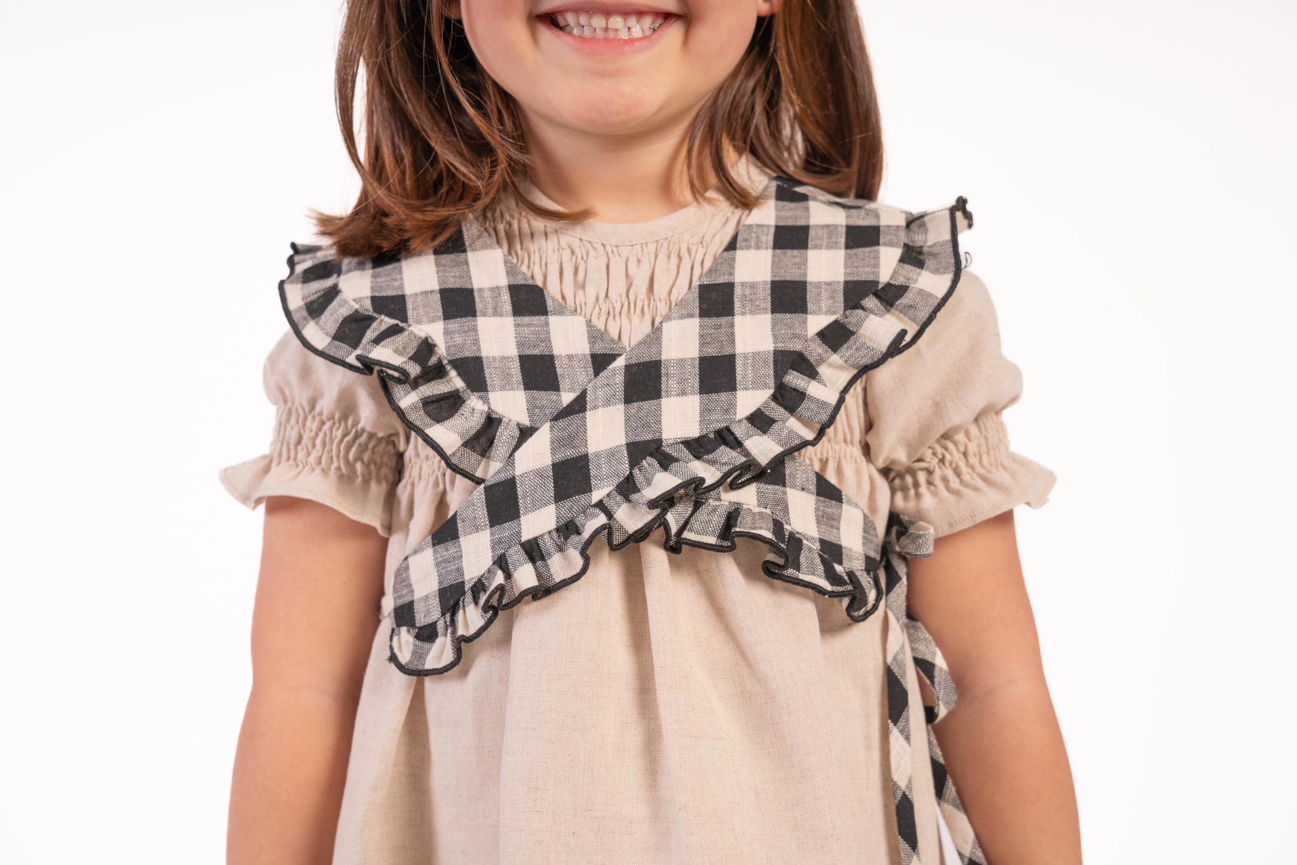 Nuestro vestido ideal para Arras es este Vestido en color lino con su pechera engomada y con la mañanita Vichy mesa del mar que puedes poner y quitar cuando quieras y así tendrás dos vestidos!