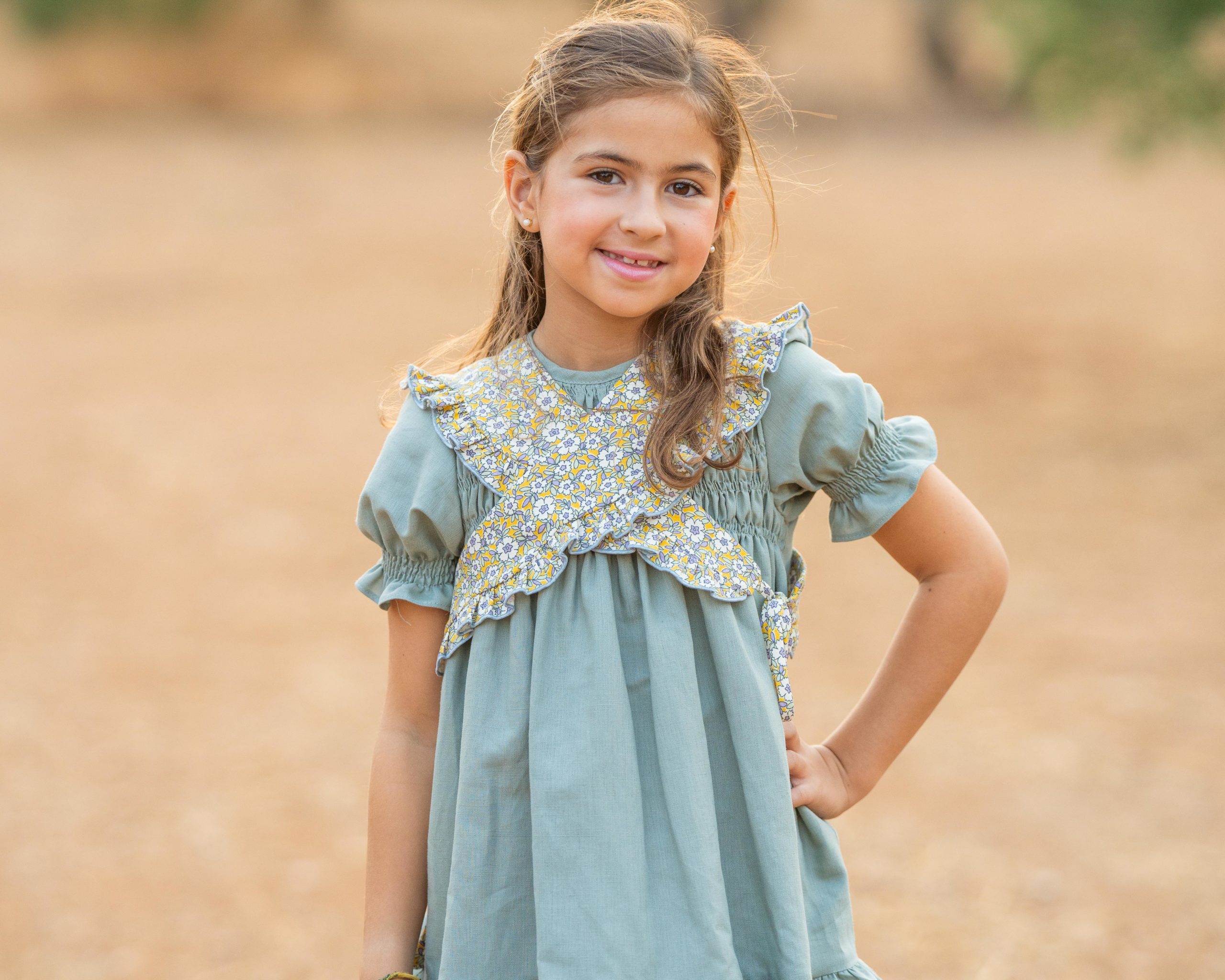 Nuestro vestido ideal para Arras es este Vestido en color verde con su pechera engomada y con la mañanita de flores mostazas, verdes y malvas que puedes poner y quitar cuando quieras. ¡así tendrás dos vestidos!